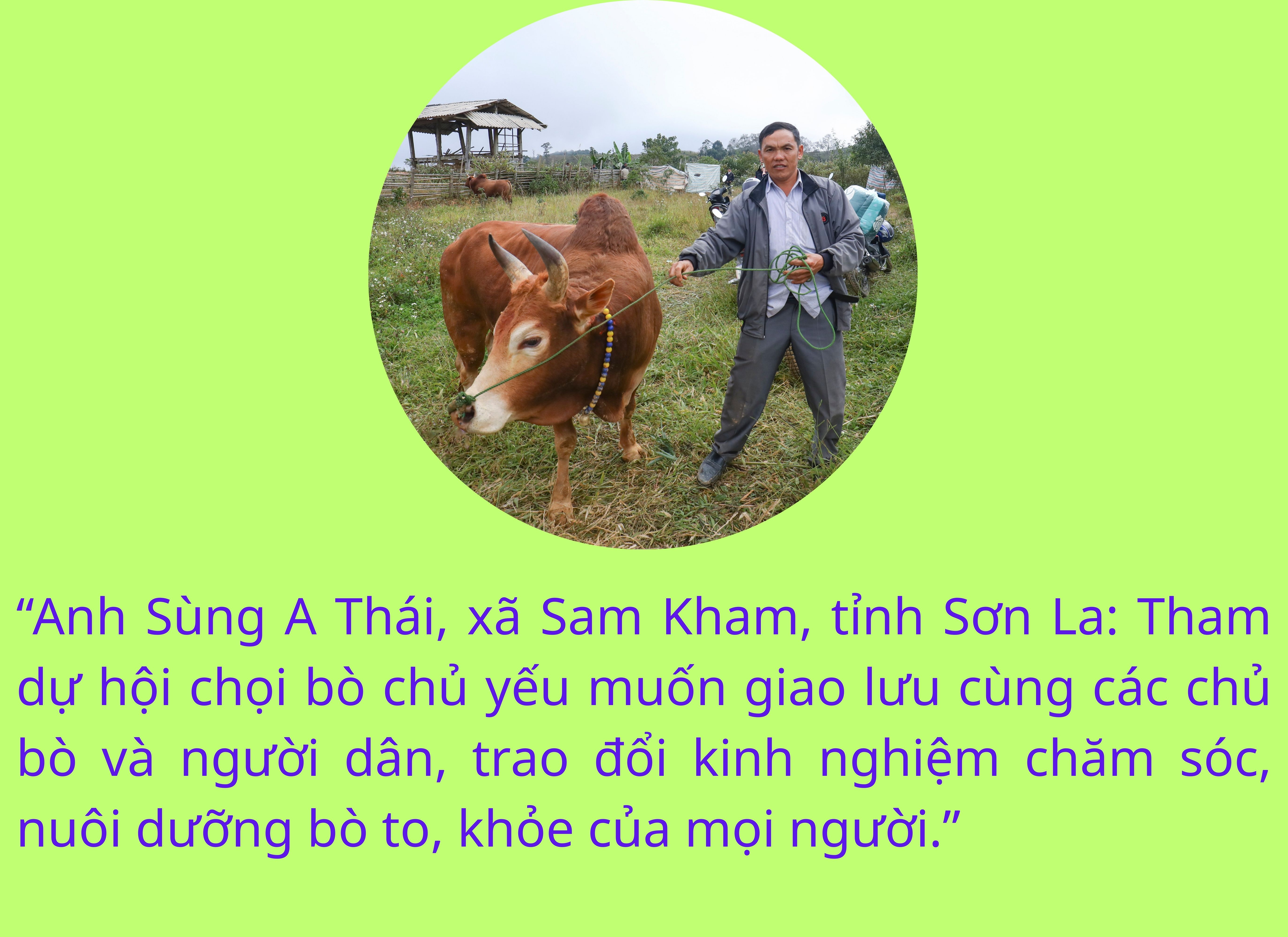 Ngoài các trận chọi bò tại hội thi, đây là dịp để các chủ bò, người dân gặp gỡ, giao lưu, trao đổi kinh nghiệm chăn nuôi, thúc đẩy phong trào nuôi bò giỏi phát triển kinh tế trên địa bàn vùng cao.