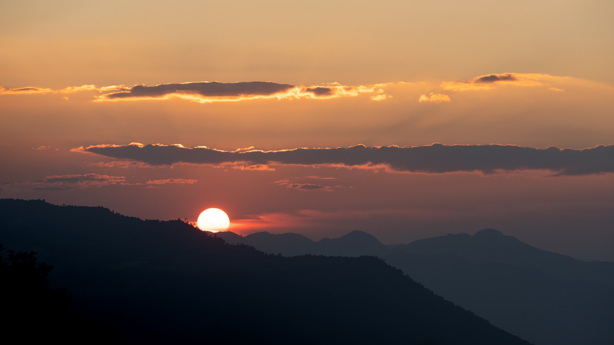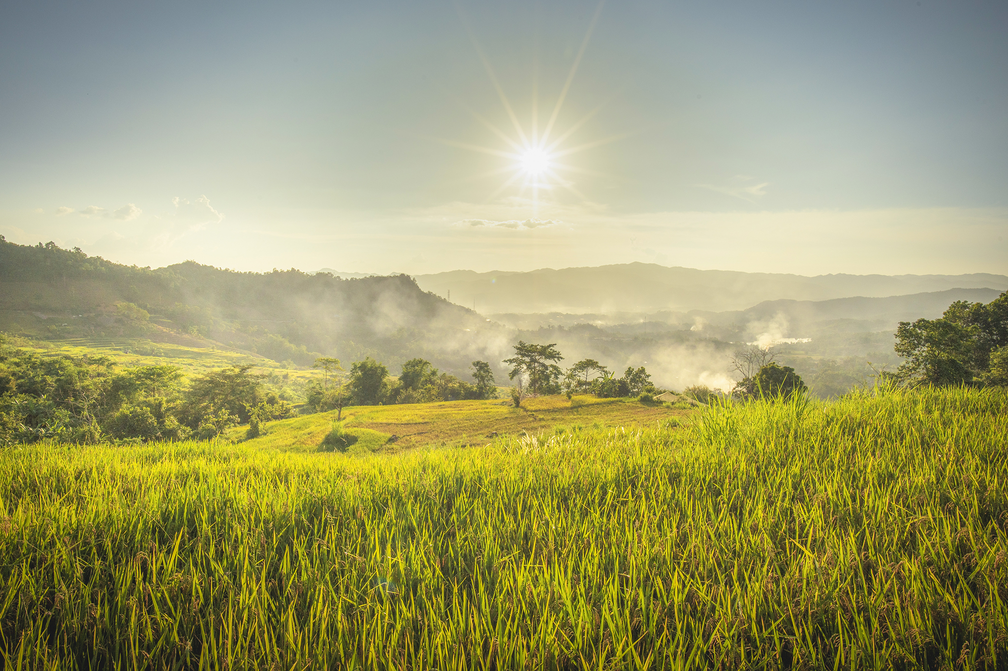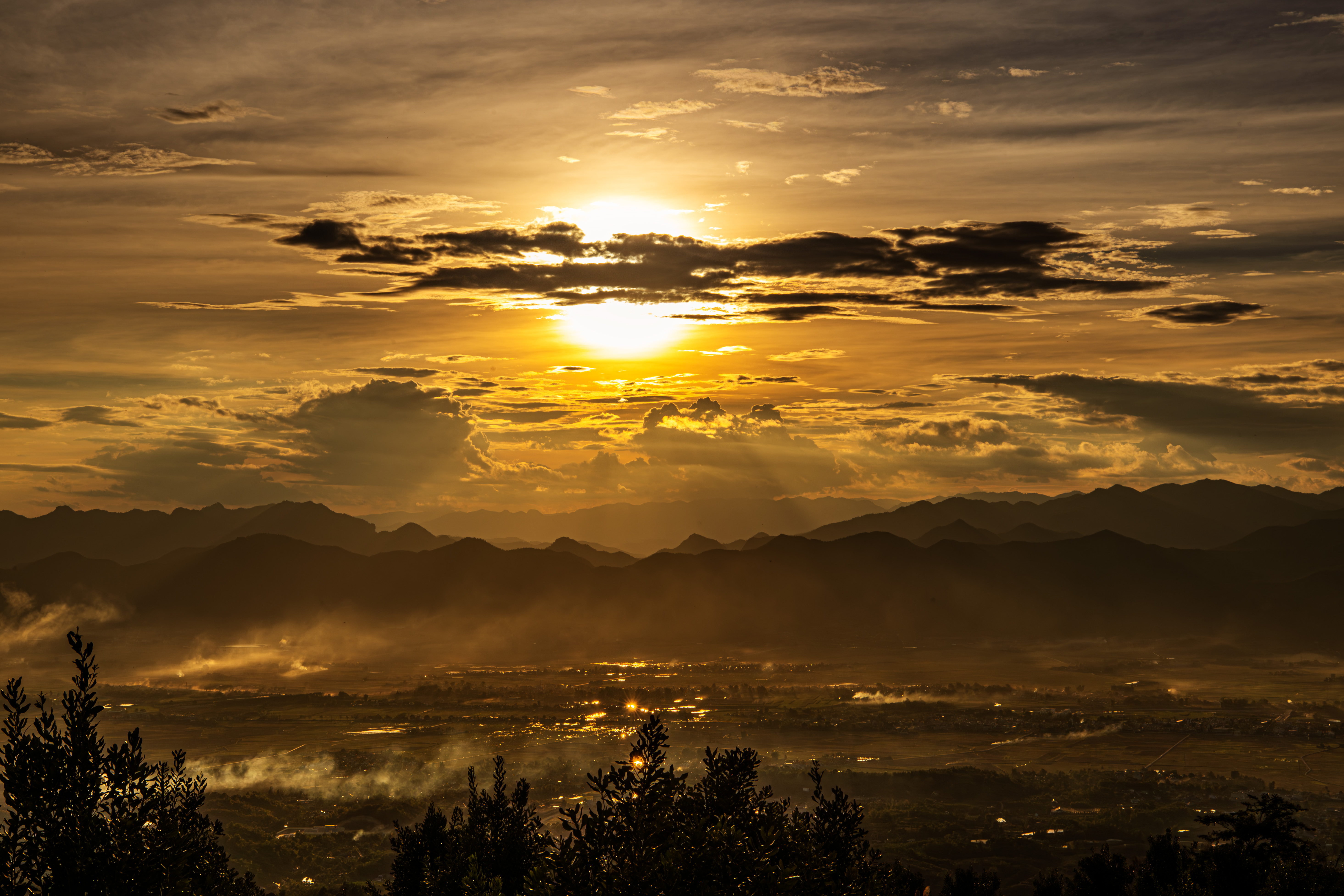 Chiều buông, mặt trời từ từ trôi về phía những dãy núi xa, để lại dải lụa vàng mềm mại vắt ngang bầu trời Điện Biên. Giữa điệp trùng núi rừng, sắc hoàng hôn tan ra trong làn sương mỏng, chậm rãi nhuộm đỏ những rặng núi, những thung lũng, những mái nhà sàn nép mình bên triền nương. Khoảnh khắc ấy, cả đất trời như lặng lại – chỉ còn ánh sáng, gió, và hương rừng quyện vào nhau, tạo nên một bản giao hòa của thiên nhiên Tây Bắc.