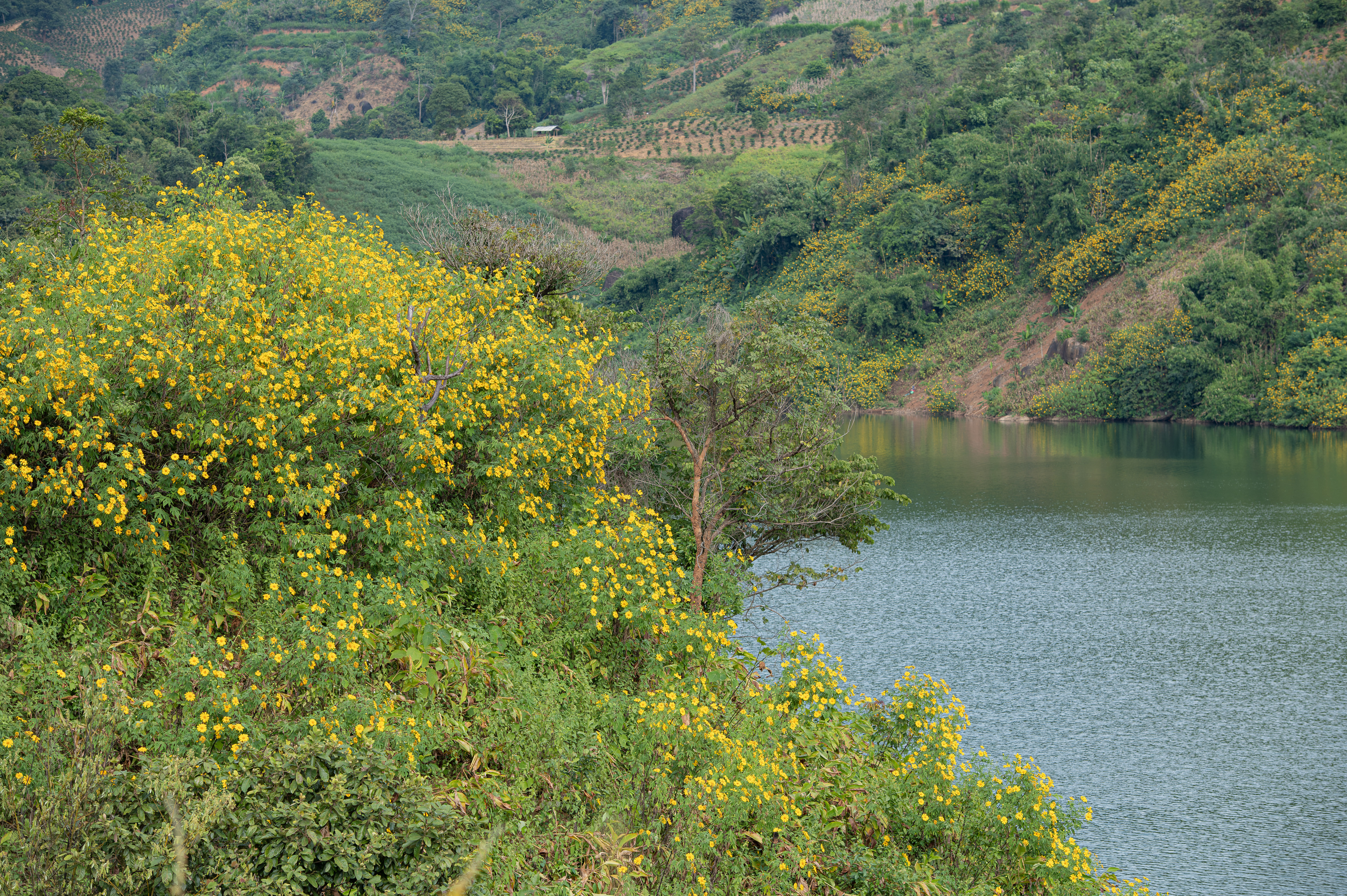 Trong rất nhiều điểm đến mùa dã quỳ ở Điện Biên, hồ chứa nước Nậm Khẩu Hu (xã Thanh Nưa), cách trung tâm phường Điện Biên Phủ khoảng 17 km, được xem là nơi mang vẻ đẹp hài hòa nhất giữa thiên nhiên và sắc hoa. Từ xa nhìn lại, mặt hồ phẳng lặng như chiếc gương xanh khổng lồ, in bóng những dải dã quỳ đang tỏa sáng dưới nắng. Hoa nở ven bờ, vươn mình nghiêng xuống mặt nước, lấp lóa theo từng gợn sóng nhẹ. Dọc theo con đường dẫn vào hồ, hai bên là những bụi dã quỳ xoè cánh vàng rực như hàng trăm chiếc nến nhỏ thắp lên sự ấm áp giữa tiết trời se lạnh.