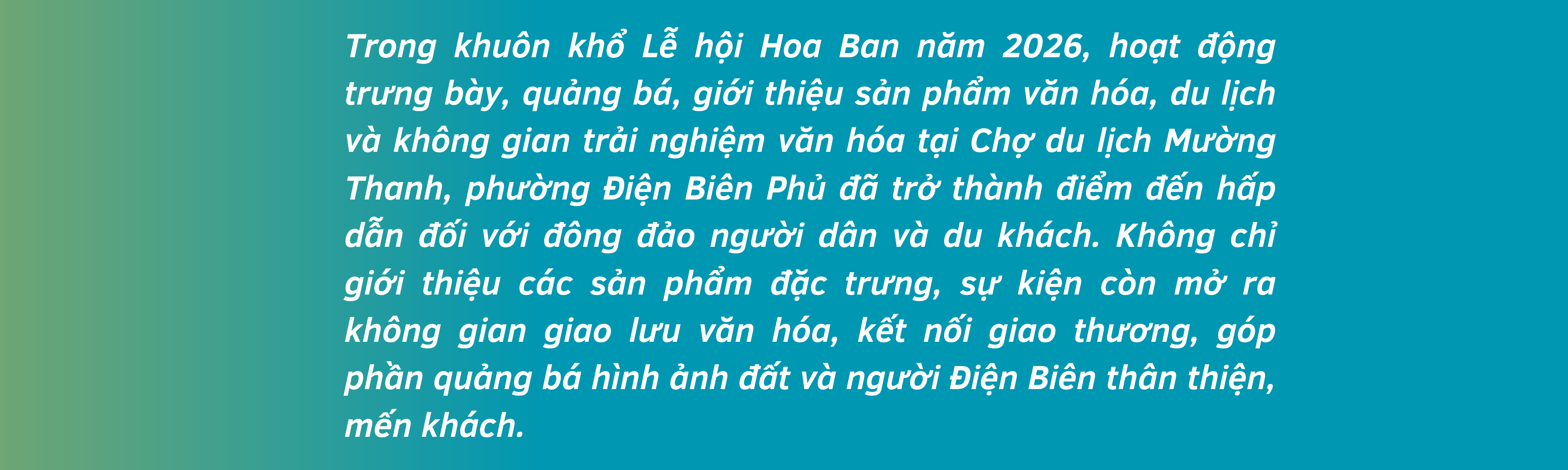 Hoạt động trưng bày, quảng bá sản phẩm văn hóa, du lịch và không gian trải nghiệm văn hóa tại Lễ hội Hoa Ban năm 2026 thu hút hơn 200 đơn vị, với gần 300 gian hàng, đến từ 23 tỉnh, thành phố trong cả nước. Nơi đây đã trở thành điểm nhấn quan trọng của Lễ hội Hoa Ban năm nay. Thông qua sự kiện, hình ảnh Điện Biên – vùng đất giàu bản sắc văn hóa, thân thiện và mến khách tiếp tục được quảng bá mạnh mẽ, góp phần thu hút du khách và thúc đẩy phát triển du lịch bền vững trong thời gian tới.