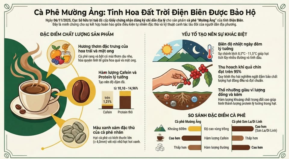 Ngày 6/11/2025, Cục Sở hữu trí tuệ (Bộ Khoa học và Công nghệ) đã cấp chứng nhận đăng ký chỉ dẫn địa lý cho sản phẩm cà phê Mường Ảng, tỉnh Điện Biên. Đây là minh chứng cho sự kết hợp hoàn hảo giữa điều kiện tự nhiên đặc thù và kỹ thuật canh tác lâu đời của người dân địa phương.