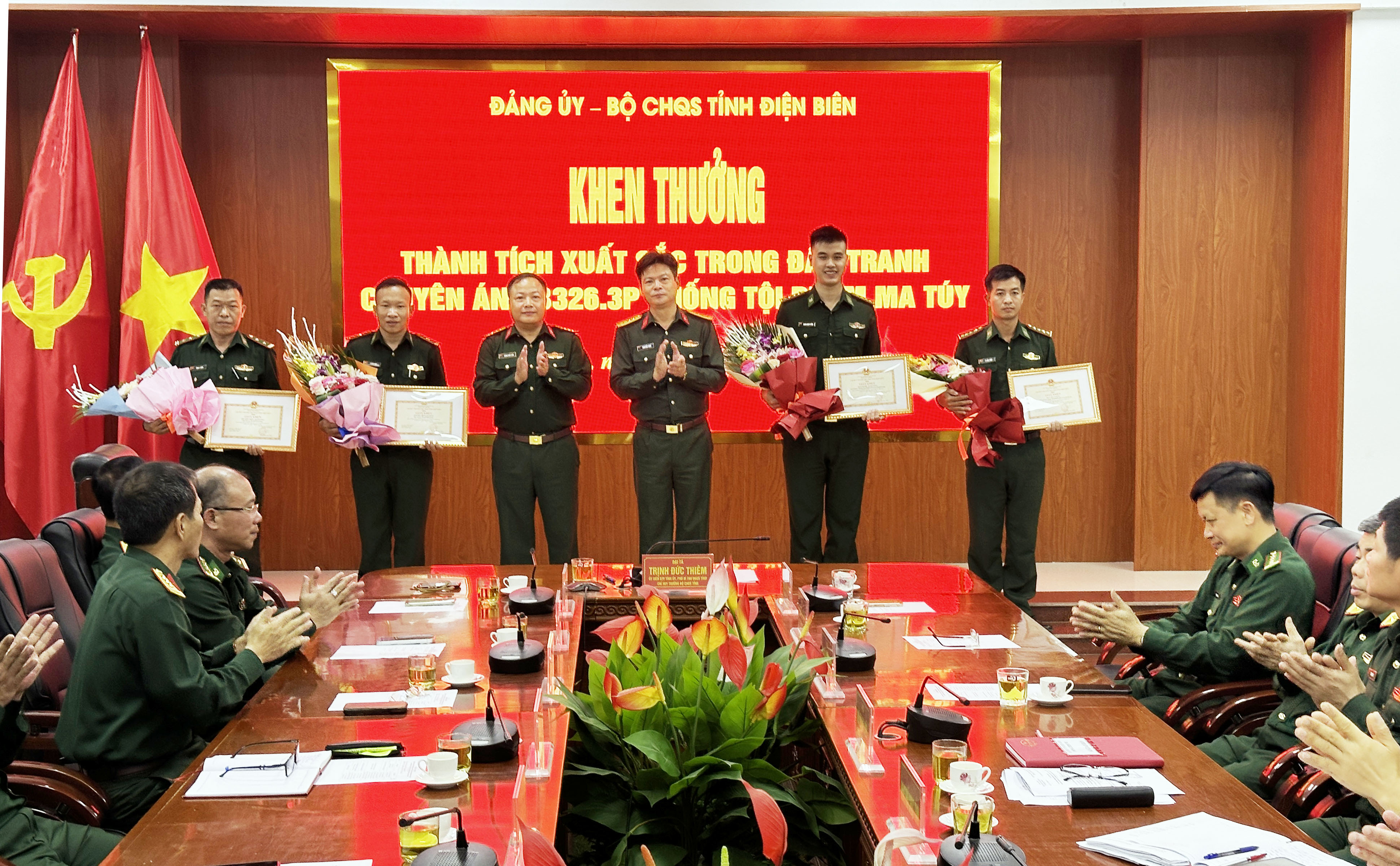 ĐBP - Ngày 7/4, Đảng ủy Bộ CHQS tỉnh tổ chức trao thưởng thành tích trong đấu tranh chuyên án ĐB326.2p về chống tội phạm ma túy. Đại tá Trịnh Đức Thiêm, Ủy viên Ban Thường vụ Tỉnh ủy, Chỉ huy trưởng Bộ CHQS tỉnh dự, trao thưởng ban chuyên án.