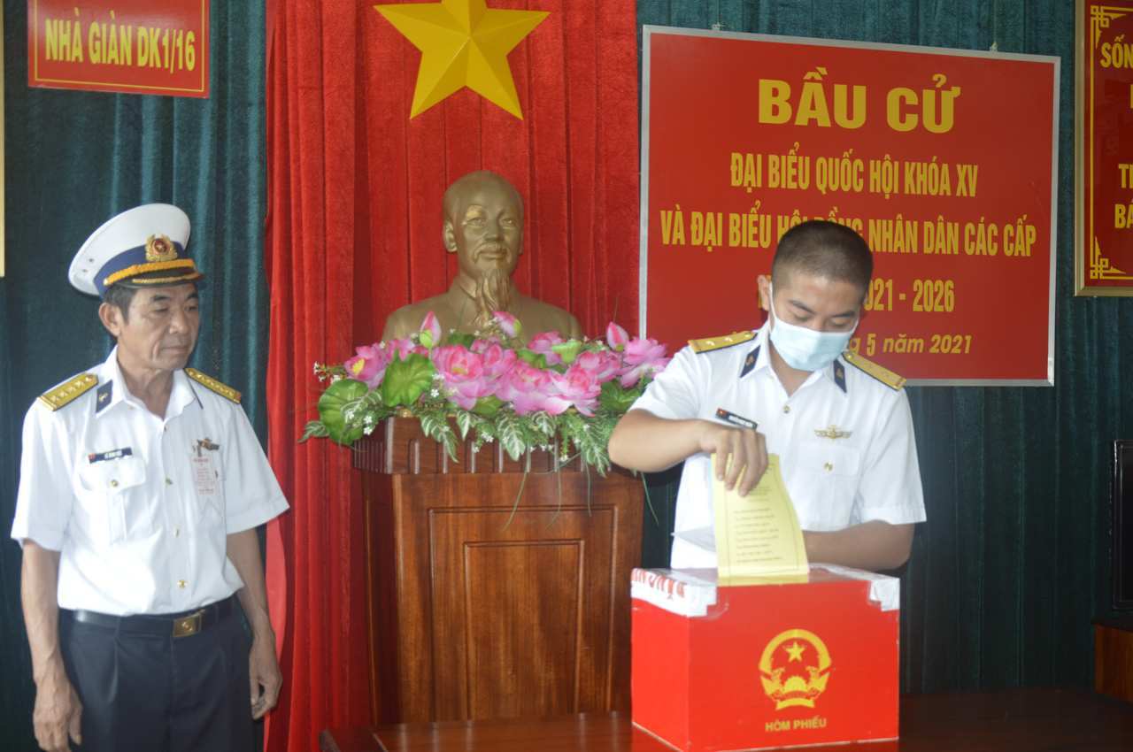 Tại các nhà giàn DK1 – nơi những người lính đang ngày đêm bám trụ nơi tuyến đầu, lễ bầu cử được tổ chức trang nghiêm, đúng quy định. Giữa bốn bề sóng nước, Quốc kỳ đỏ thắm tung bay, thùng phiếu được niêm phong cẩn trọng, đặt trang trọng như một biểu tượng sống động của quyền làm chủ của Nhân dân gắn liền với chủ quyền quốc gia.
