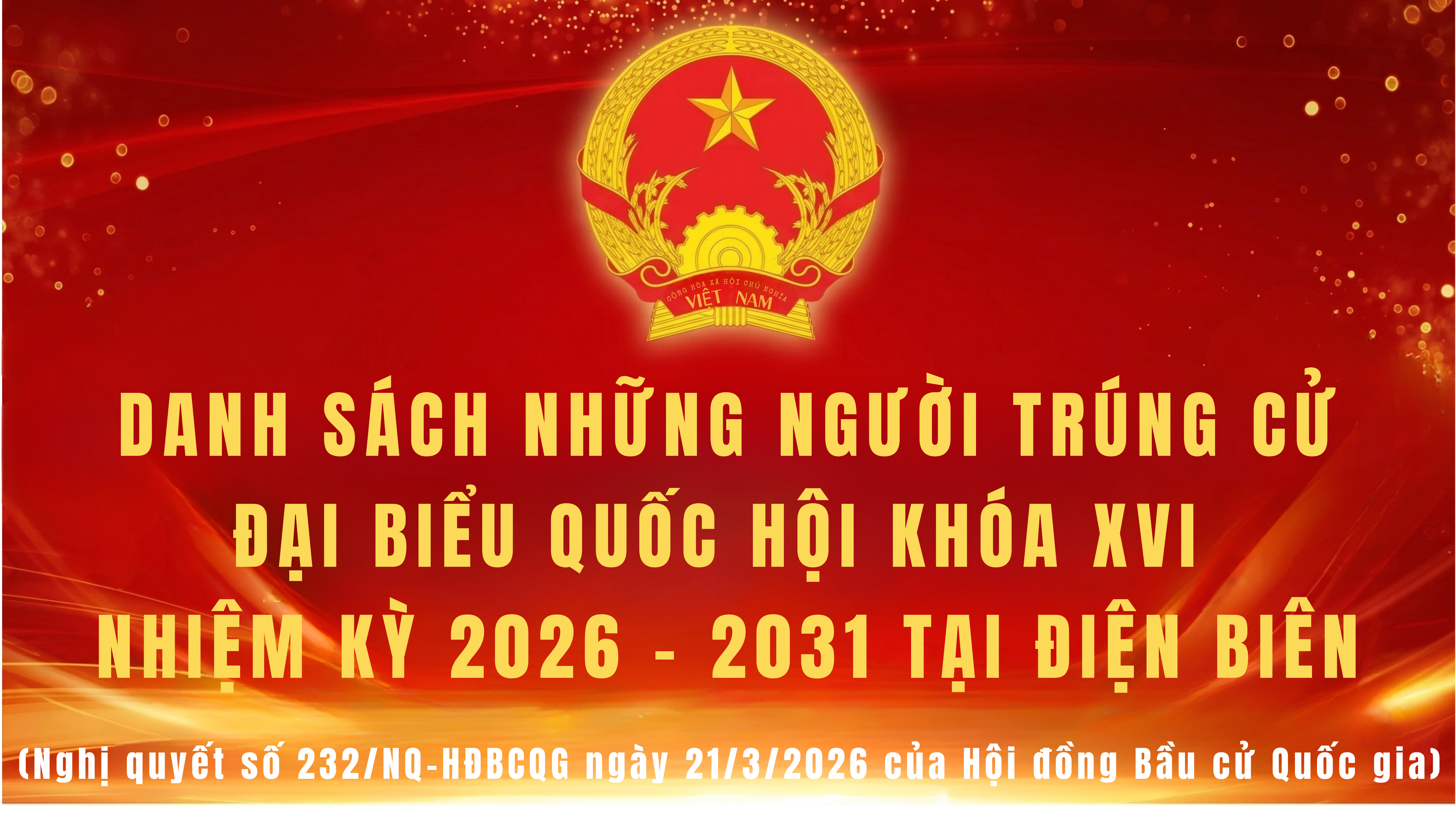 ĐBP - Ngày 21/3, Hội đồng Bầu cử Quốc gia đã công bố danh sách Đại biểu Quốc hội khóa XVI và đại biểu HĐND các cấp nhiệm kỳ 2026 - 2031. Báo và phát thanh, truyền hình Điện Biên trân trọng giới thiệu danh sách chính thức đại biểu Quốc hội khóa XVI, nhiệm kỳ 2026 - 2031 tỉnh Điện Biên.