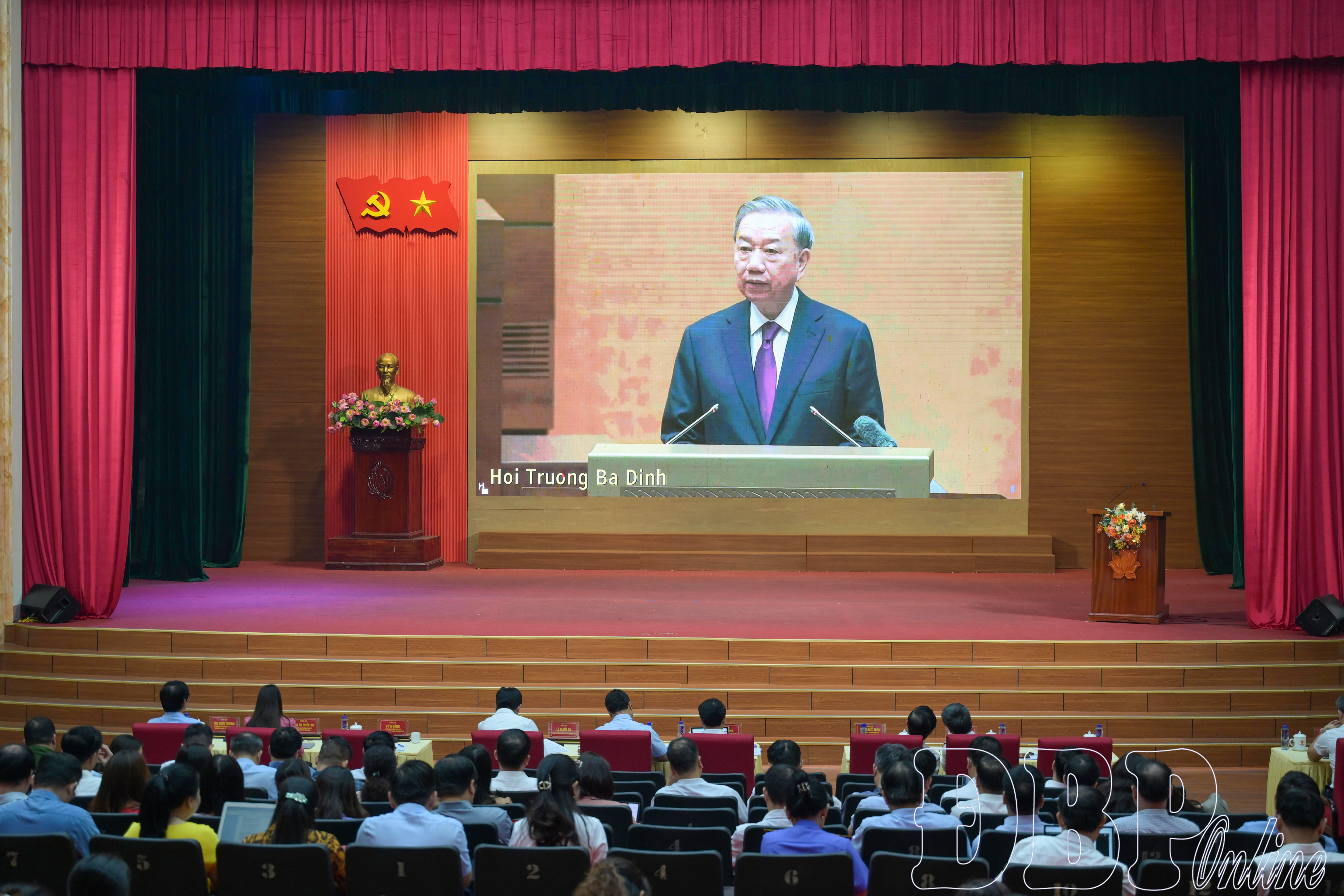 Dự hội nghị tại điểm cầu tỉnh Điện Biên có các đồng chí: Trần Tiến Dũng, Ủy viên Trung ương Đảng, Bí thư Tỉnh ủy, Trưởng Đoàn ĐBQH tỉnh; Lê Thành Đô, Phó Bí thư Thường trực Tỉnh ủy, Chủ tịch HĐND tỉnh; Mùa A Vảng, Ủy viên dự khuyết Trung ương Đảng, Phó Bí thư Tỉnh ủy, Chủ tịch Ủy ban MTTQ Việt Nam tỉnh; các đồng chí Thường trực Tỉnh ủy, HĐND tỉnh; Ban Thường vụ Tỉnh ủy, Ban Chấp hành Đảng bộ tỉnh cùng đại diện lãnh đạo các ban, sở, ngành tỉnh.