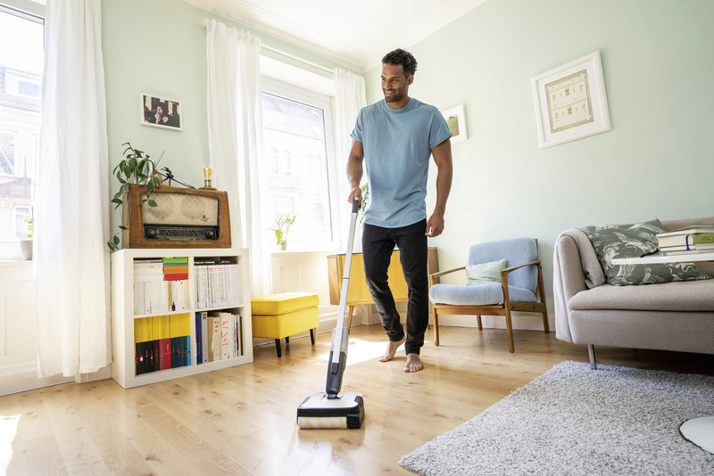 Kaercher tích hợp cả chức năng hút bụi và lau nhà trong một thiết bị, giúp bạn tiết kiệm đáng kể thời gian và công sức. Bạn không cần phải quét hoặc hút bụi trước khi lau, mà có thể hoàn thành cả hai việc chỉ trong một lần di chuyển. Các con lăn microfiber tự động quay với tốc độ cao không chỉ đánh bay vết bẩn mà còn hút sạch cả bụi khô và các mảnh vụn nhỏ như tóc, lông thú cưng.