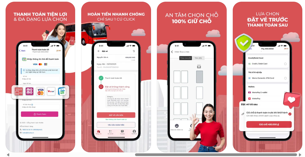Đa dạng phương thức thanh toán và tiện lợi: Giao diện thân thiện giúp người mới dễ dàng làm quen và thao tác. Bạn còn có thể lựa chọn vị trí ghế trống yêu thích thông qua sơ đồ xe trực quan. redBus hỗ trợ nhiều phương thức thanh toán an toàn và phổ biến như thẻ tín dụng, ví điện tử (MoMo, ZaloPay), chuyển khoản ngân hàng… giúp việc thanh toán trở nên dễ dàng và linh hoạt hơn bao giờ hết.