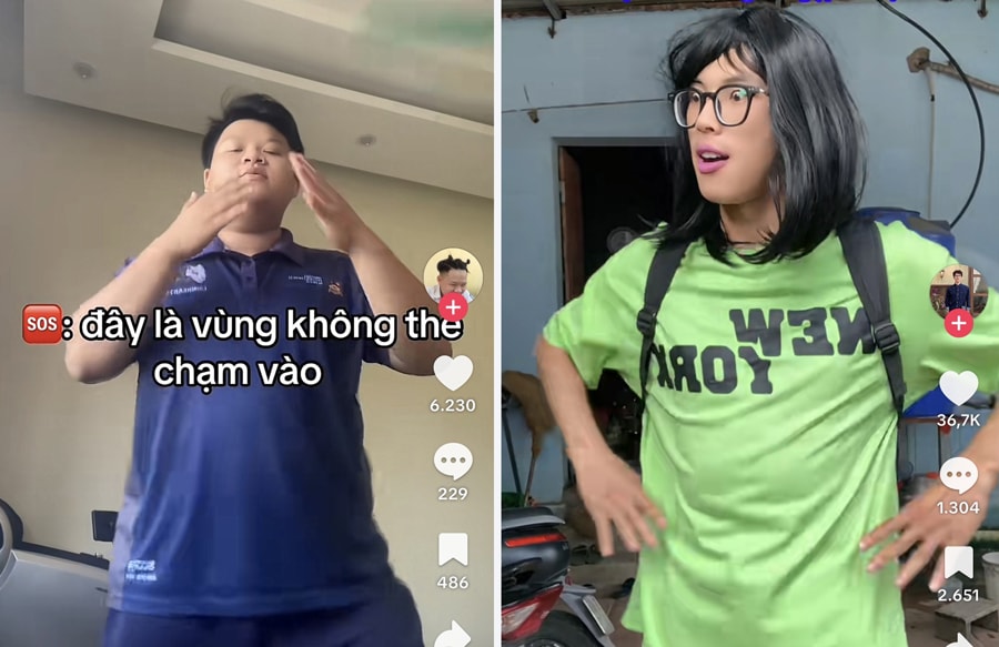 Tuy nhiên, đáng nói là không ít video đã "bắt trend” (trào lưu) quá đà, gây cười giải trí bằng cách thêm vào nhiều động tác, biểu cảm cợt nhả, dung tục để thu hút người xem. Một số nội dung cố tình bị “chế” thành những câu phản giáo dục như “ở đây là vùng ta cứ chạm vào”, “tôi sẽ đấm vào mồm bạn”…
