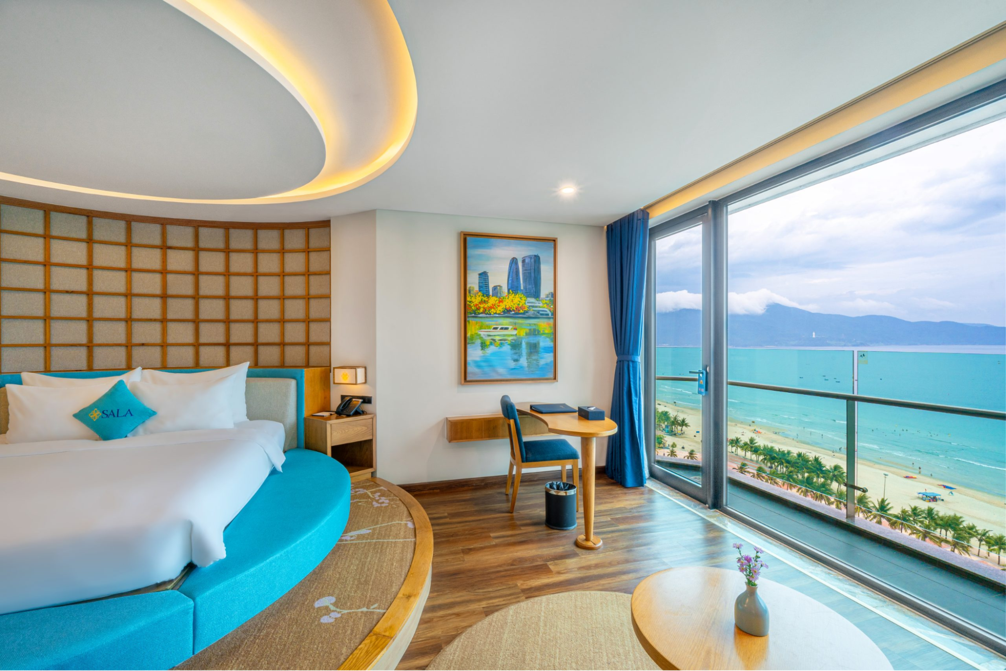 Điểm mạnh của Sala Danang Beach Hotel nằm ở cách bố trí không gian nghỉ dưỡng. Các phòng nghỉ được thiết kế mở, tận dụng tối đa ánh sáng tự nhiên và tầm nhìn hướng biển. Buổi sáng, nhiều du khách chọn bắt đầu ngày mới bằng việc ngắm biển từ ban công phòng hoặc từ hồ bơi trên cao.