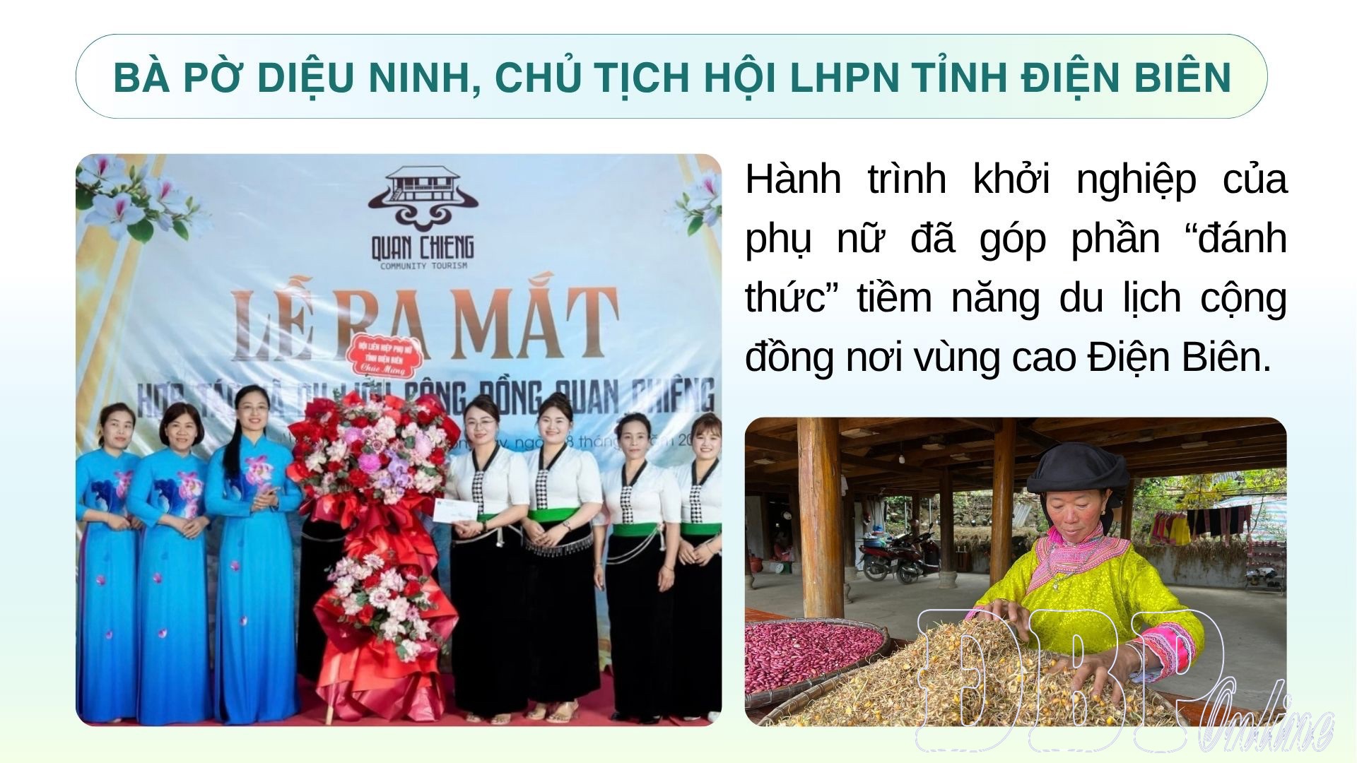 Những câu chuyện trên là minh chứng tiêu biểu, đại diện cho nhiều phụ nữ vùng cao khác đang dám nghĩ, dám làm, quyết tâm phát triển du lịch bằng chính bản sắc văn hóa và tiềm năng sẵn có của địa phương. Chủ tịch Hội Liên hiệp Phụ nữ tỉnh Pờ Diệu Ninh cho biết: Từ những người chỉ gắn bó với ruộng nương, nhiều chị em đã mạnh dạn chuyển mình, từng bước xây dựng mô hình du lịch từ chính nền tảng văn hóa dân tộc. Hành trình khởi nghiệp của những người phụ nữ dân tộc thiểu số đã góp phần "đánh thức" tiềm năng du lịch cộng đồng nơi vùng cao. Quan trọng hơn, đó là câu chuyện truyền cảm hứng về nghị lực, khát vọng vươn lên của phụ nữ Điện Biên làm giàu trên chính quê hương.