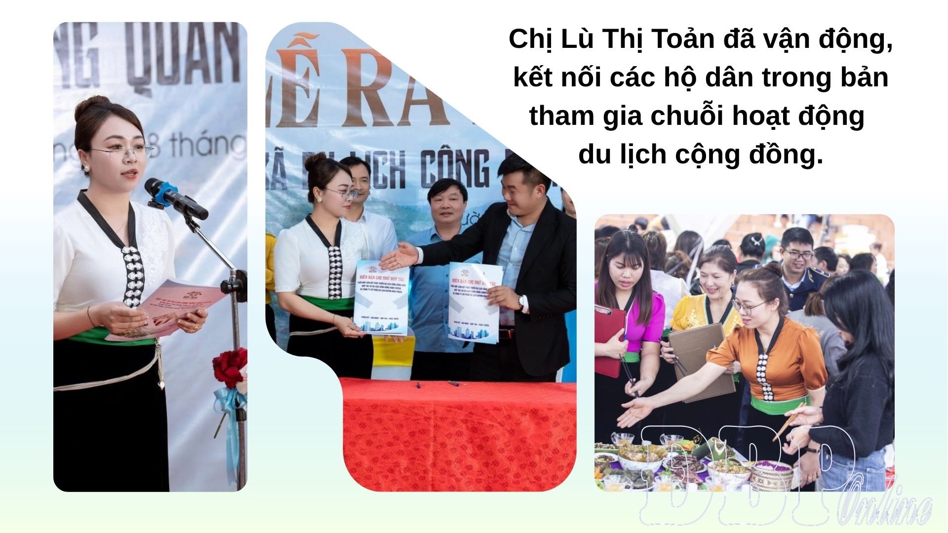 Để tạo dựng sản phẩm du lịch mang bản sắc riêng, chị khuyến khích bà con khôi phục nghề dệt thổ cẩm, duy trì sinh hoạt văn hóa cộng đồng như múa xòe, đánh chiêng, tổ chức giao lưu văn nghệ phục vụ du khách. Chị Toản còn tích cực quảng bá hình ảnh du lịch Mường Lay thông qua mạng xã hội, liên kết với các công ty lữ hành để đưa khách về địa phương. Nhờ đó, lượng khách đến với các homestay ở Mường Lay ngày càng tăng, giúp nhiều hộ dân có thêm thu nhập.