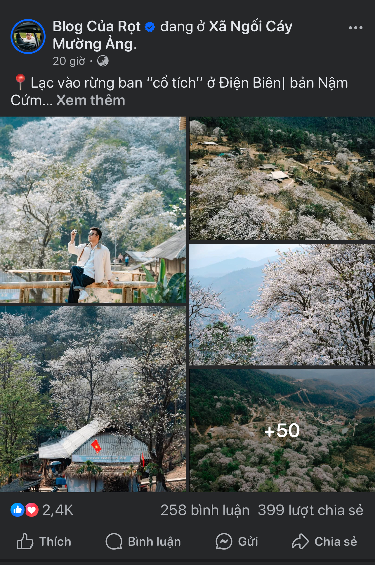 Sở hữu gần 207 nghìn lượt theo dõi trên tiktok với 6,3 triệu lượt thích, Blog Của Rọt là một trong số những thành viên tham gia đoàn Presstrip từ ngày đầu tiên đến ngày cuối cùng. Dù là lần thứ 2 đến Điện Biên nhưng chuyến đi này đã để lại cho blogger trẻ đến từ Quảng Nam xa xôi thêm nhiều ấn tượng sâu đậm về mảnh đất cực Tây. Đặc biệt, khi anh đặt chân đến rừng ban cổ Nặm Cứm, xã Ngối Cáy, huyện Mường Ảng - nơi anh gọi là khu rừng cổ tích. Viết trên trang blog cá nhân facebook Blog Của Rọt, chàng travel blogger chia sẻ: “Mình không tin có khu rừng cổ tích cho đến khi đặt chân đến bản Nặm Cứm, nơi đây có khoảng 1.200 cây ban cổ thụ, lần đầu tiên mình được chứng kiến gốc cây ban to khổng lồ, phải 3 đến 4 người ôm mới hết. Thật may mắn, thời điểm này đúng hoa ban nở rộ, phủ trắng cả bản làng, nói không quá nhưng Nặm Cứm chính là địa điểm đẹp nhất ở Điện Biên thời điểm này. Sau hơn 1 giờ di chuyển từ thành phố vào bản, rừng ban dần dần hiện ra trước mắt, mình như được xoa dịu đi sự lừ đừ, đắm chìm trong sắc trắng tinh khôi của nàng ban rừng. Một khung cảnh vô thực nằm gọn trong đôi mắt của chàng Khum xứ Quảng, không khác gì khu rừng cổ tích ngoài đời thực…”.
