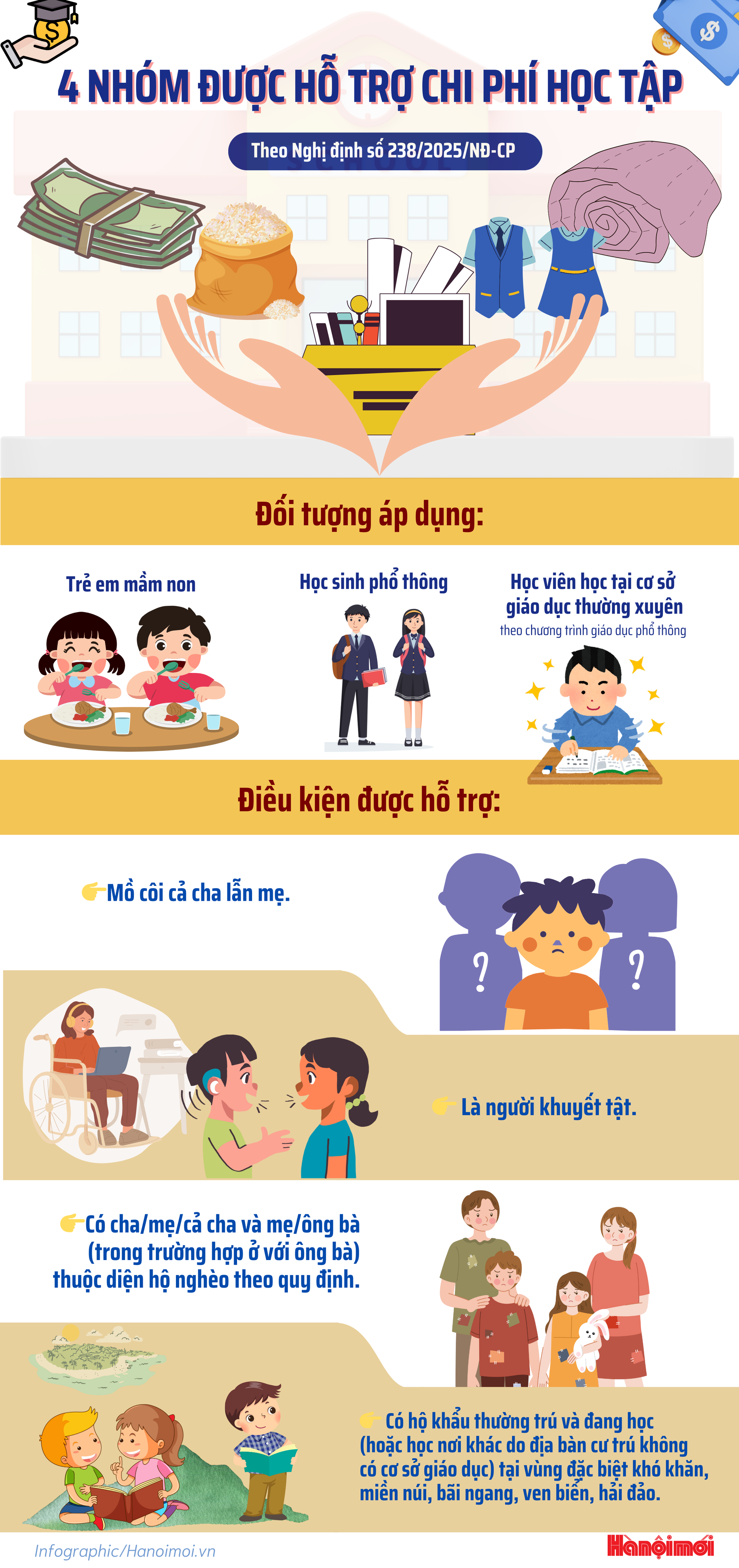 Theo Nghị định 238/2025/NĐ-CP, ngoài các đối tượng được miễn, giảm học phí, có 4 nhóm trẻ em mầm non, học sinh phổ thông, học viên hệ giáo dục thường xuyên được hỗ trợ chi phí học tập, gồm: Mồ côi, khuyết tật, thuộc hộ nghèo hoặc đang học tại vùng đặc biệt khó khăn.