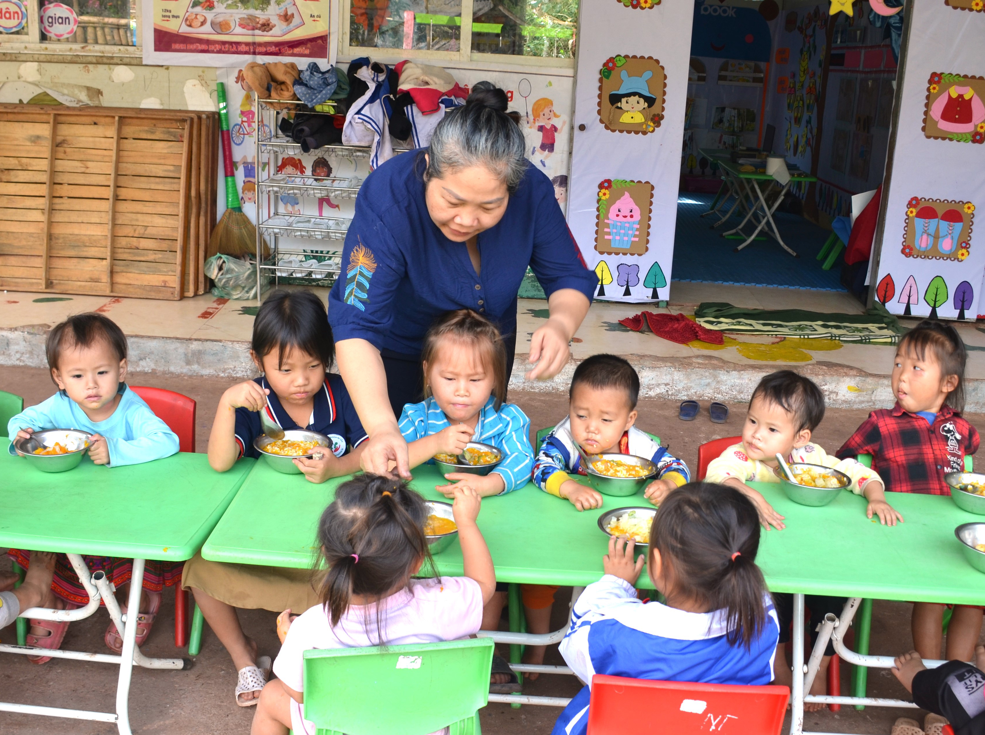 Chúng tôi đến Điểm trường Huổi Quang (xã Mường Chà) đúng lúc cô và trò đang chuẩn bị bữa trưa. Trong ngôi trường nhỏ, cô Lò Thị Thùy Dương (giáo viên Trường Mầm non Pa Tần) - người có gần 17 năm gắn bó với nghề nhẹ nhàng đi từng bàn kiểm tra bữa ăn của học sinh. Ba năm giảng dạy tại bản Huổi Quang, cô Dương đã quen với những gian khó của “bản đa không”: Không điện, không mạng, không sóng điện thoại và đường giao thông đi lại khó khăn, vất vả.