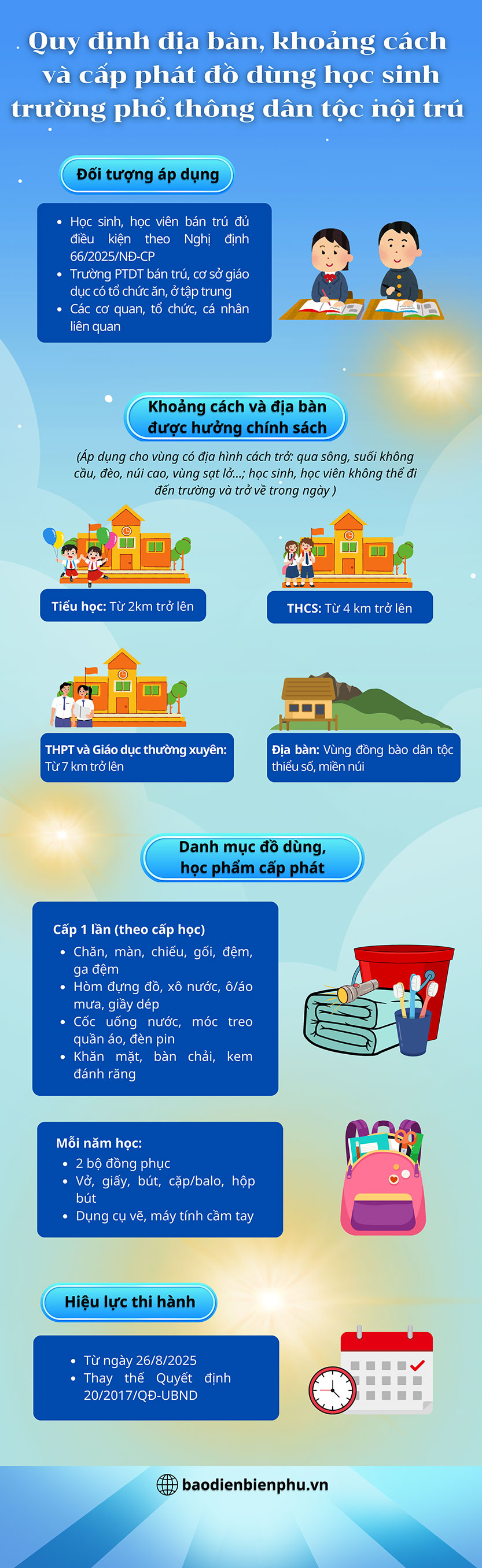 ĐBP - UBND tỉnh vừa ban hành Quyết định số 43/2025/QĐ-UBND quy định rõ địa bàn, khoảng cách và danh mục đồ dùng cá nhân, học phẩm cấp phát cho học sinh trường phổ thông dân tộc nội trú trên địa bàn tỉnh. Theo đó, học sinh tiểu học ở cách trường từ 2km, THCS từ 4km, THPT và giáo dục thường xuyên từ 7km trở lên trong điều kiện địa hình cách trở sẽ được hưởng chính sách hỗ trợ. Ngoài đồ dùng thiết yếu cấp một lần, mỗi năm học sinh còn được cấp đồng phục và học phẩm phục vụ học tập.