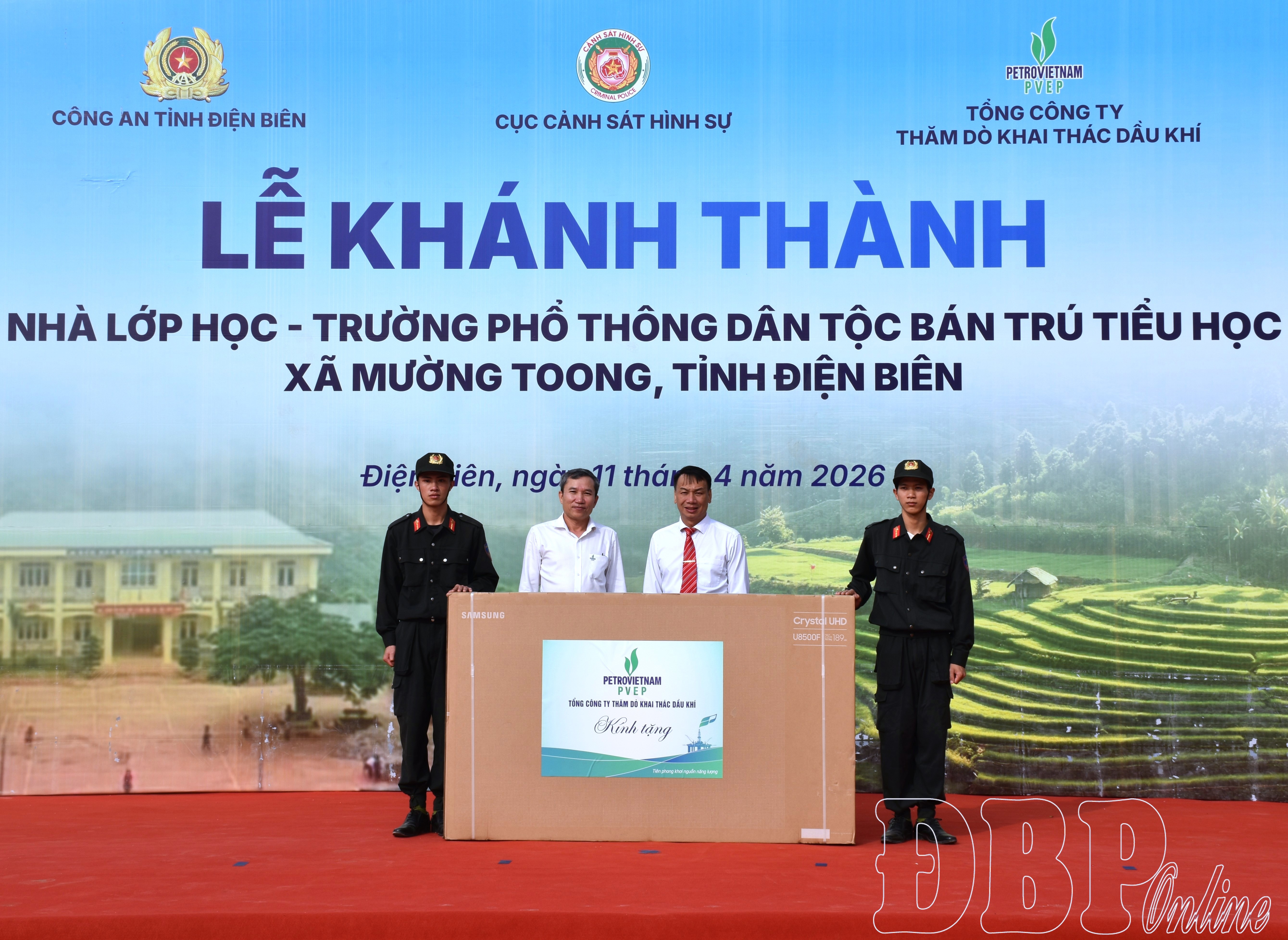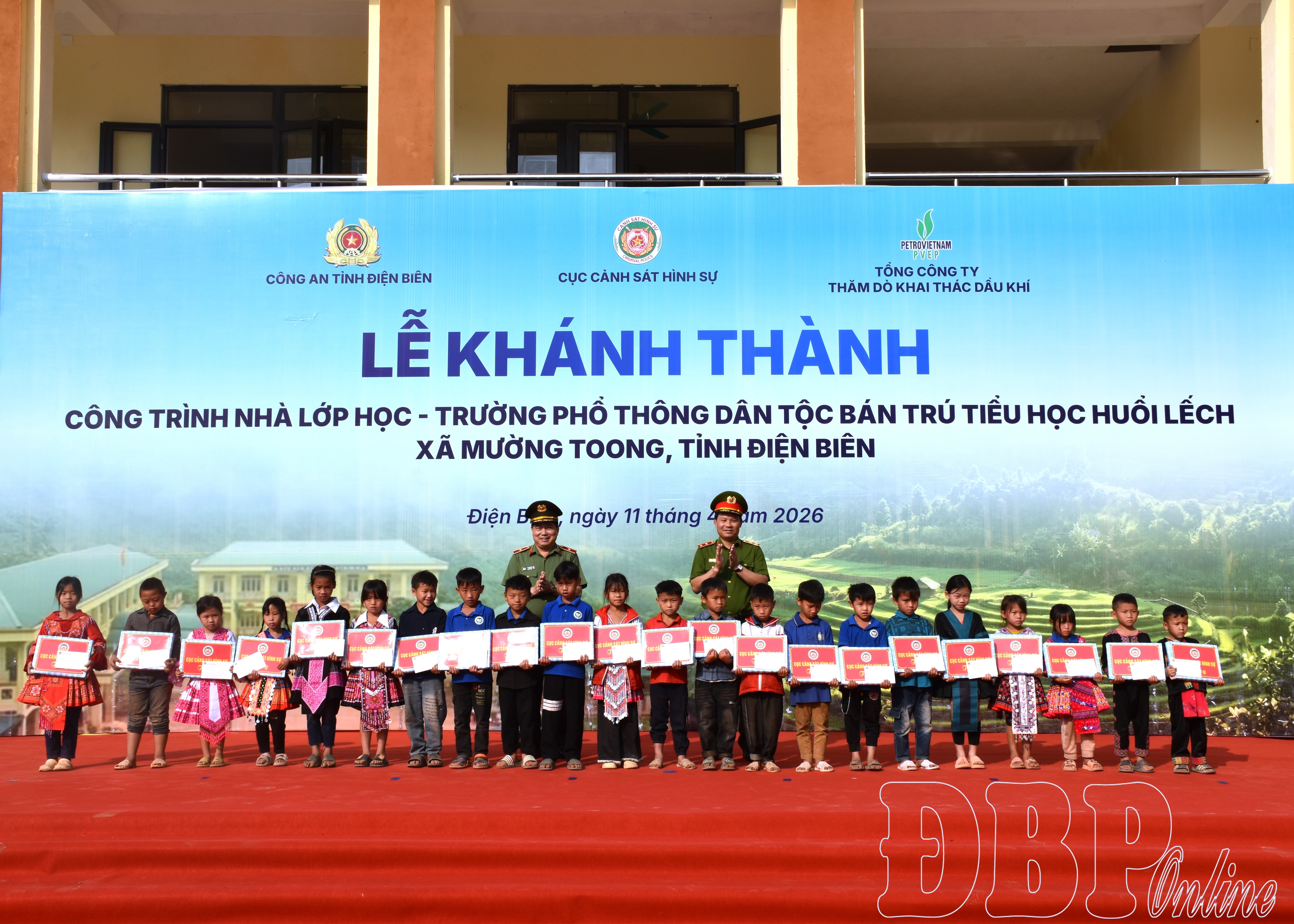 ĐBP - Sáng 11/4, Công an tỉnh phối hợp với Cục Cảnh sát hình sự (Bộ Công an) và Tổng Công ty Thăm dò khai thác dầu khí (PVEP) thuộc Tập đoàn Công nghiệp - Năng lượng quốc gia Việt Nam tổ chức khánh thành, gắn biển công trình nhà, lớp học tại Trường Phổ thông Dân tộc bán trú (PTDTBT) Tiểu học Huổi Lếch, xã Mường Toong.