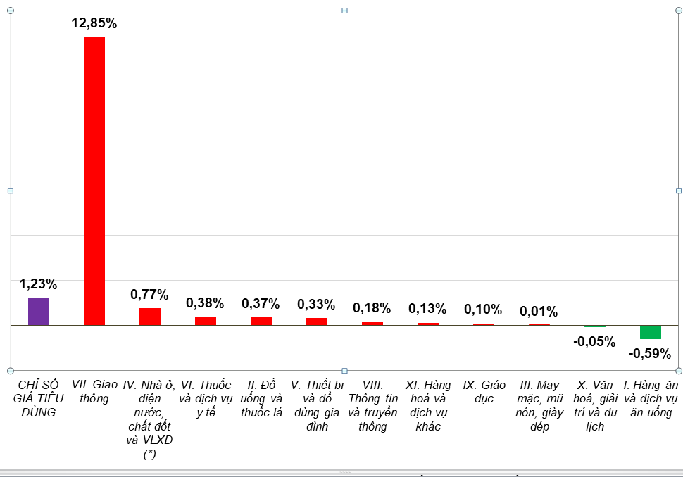 Chín nhóm hàng hóa và dịch vụ có chỉ số giá tăng gồm: Nhóm giao thông tăng 12,85% (tác động làm CPI chung tăng 1,28 điểm phần trăm), chủ yếu do giá xăng dầu tăng mạnh.
