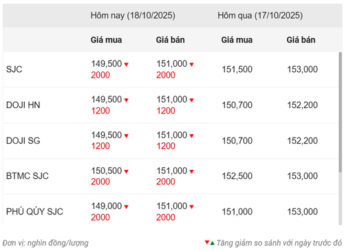 Cụ thể, tại thời điểm 11 giờ 30 phút ngày 18/10, Công ty Vàng bạc đá quý Sài Gòn (SJC) niêm yết giá vàng miếng SJC mua vào-bán ra ở mức 149,5-151 triệu đồng/lượng, giảm 2 triệu đồng mỗi lượng ở cả chiều mua vào và chiều bán ra so chốt phiên hôm trước. Chênh lệch mua-bán ở mức 1,5 triệu đồng.