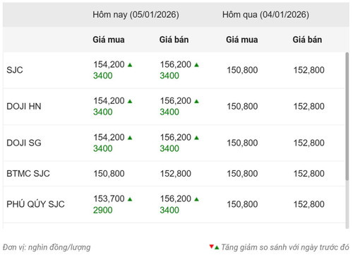 Cụ thể, tại thời điểm 9 giờ ngày 5/1, Công ty Vàng bạc đá quý Sài Gòn (SJC) niêm yết giá vàng miếng SJC mua vào-bán ra ở mức 154,2-156,2 triệu đồng/lượng, tăng 3,4 triệu đồng so chốt phiên trước đó. Chênh lệch mua-bán 2 triệu đồng/lượng.