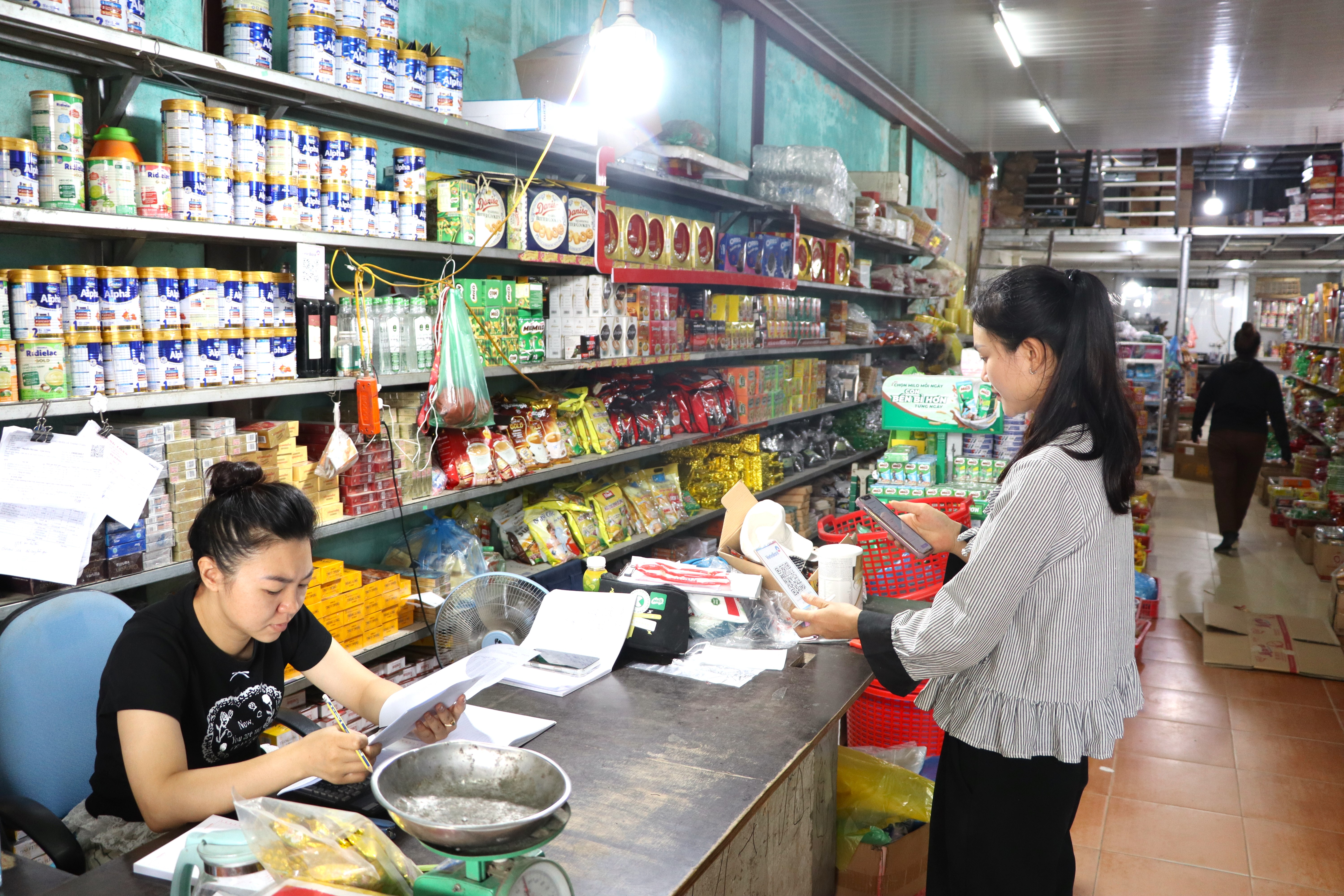 Anh Nguyễn Bá Hưng, chủ cửa hàng tạp hóa với hơn 10 năm kinh doanh tại bản, là một trong những hộ tiên phong chuyển đổi số. Trước đây, việc ghi chép, thanh toán đều làm thủ công, mất nhiều thời gian và dễ sai sót. Từ khi bản triển khai xây dựng NTM thông minh, anh Hưng đã đưa công nghệ vào mọi khâu trong hoạt động kinh doanh.
