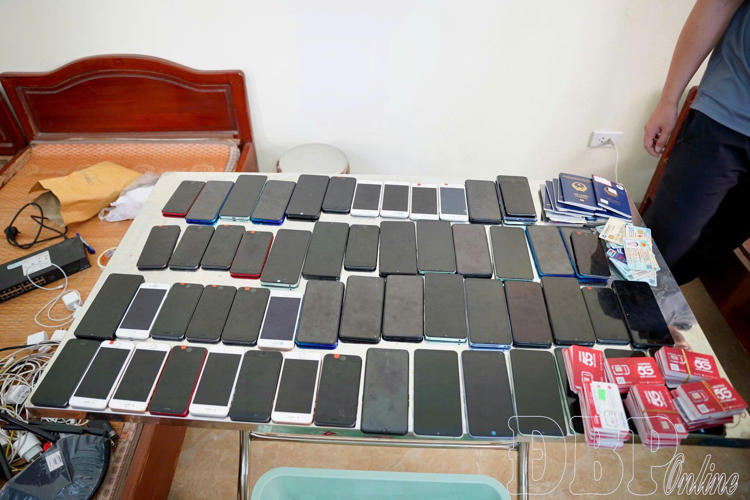hàng trăm thiết bị điện tử, sim rác, máy tính cùng nhiều tài liệu, kịch bản lừa