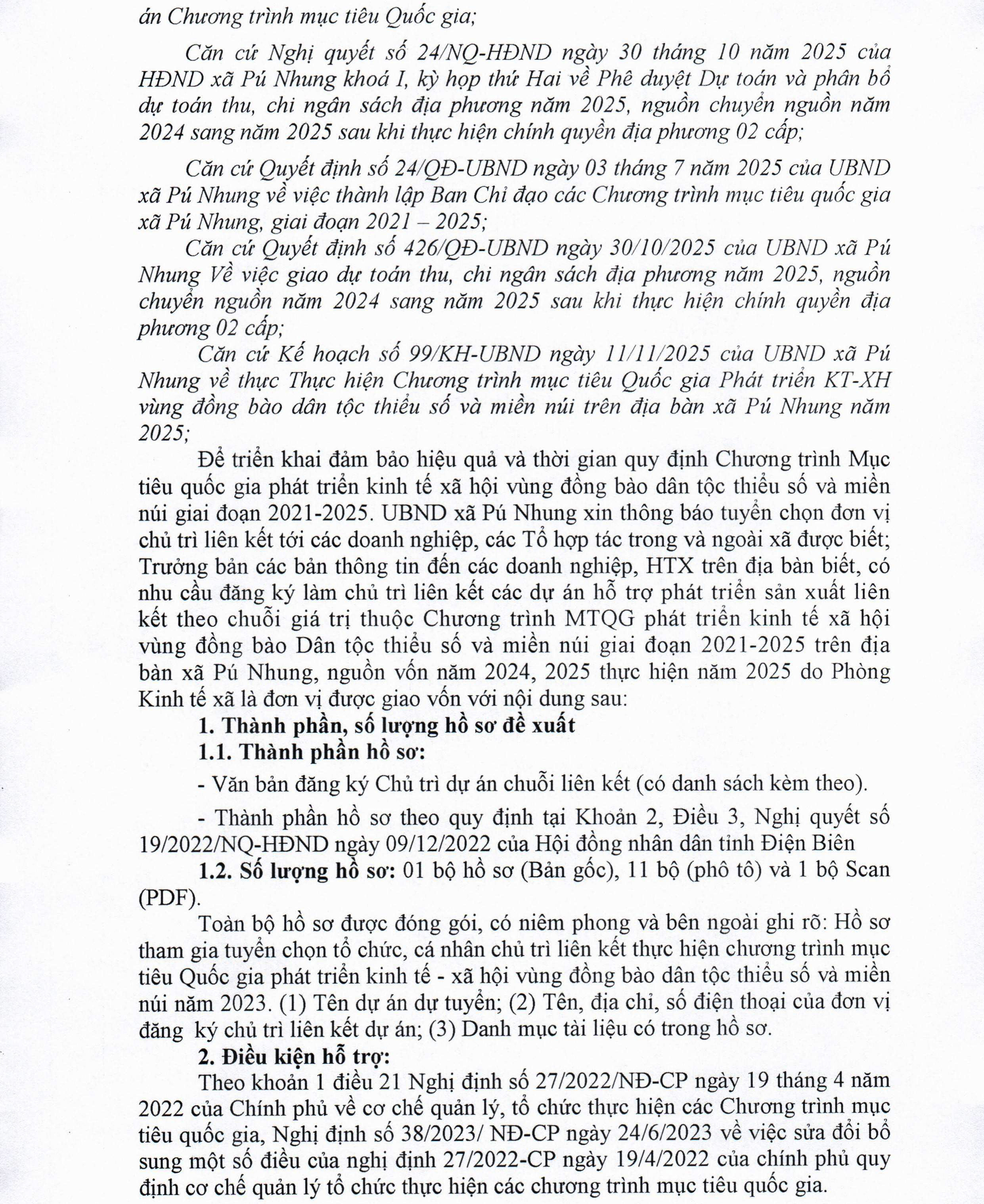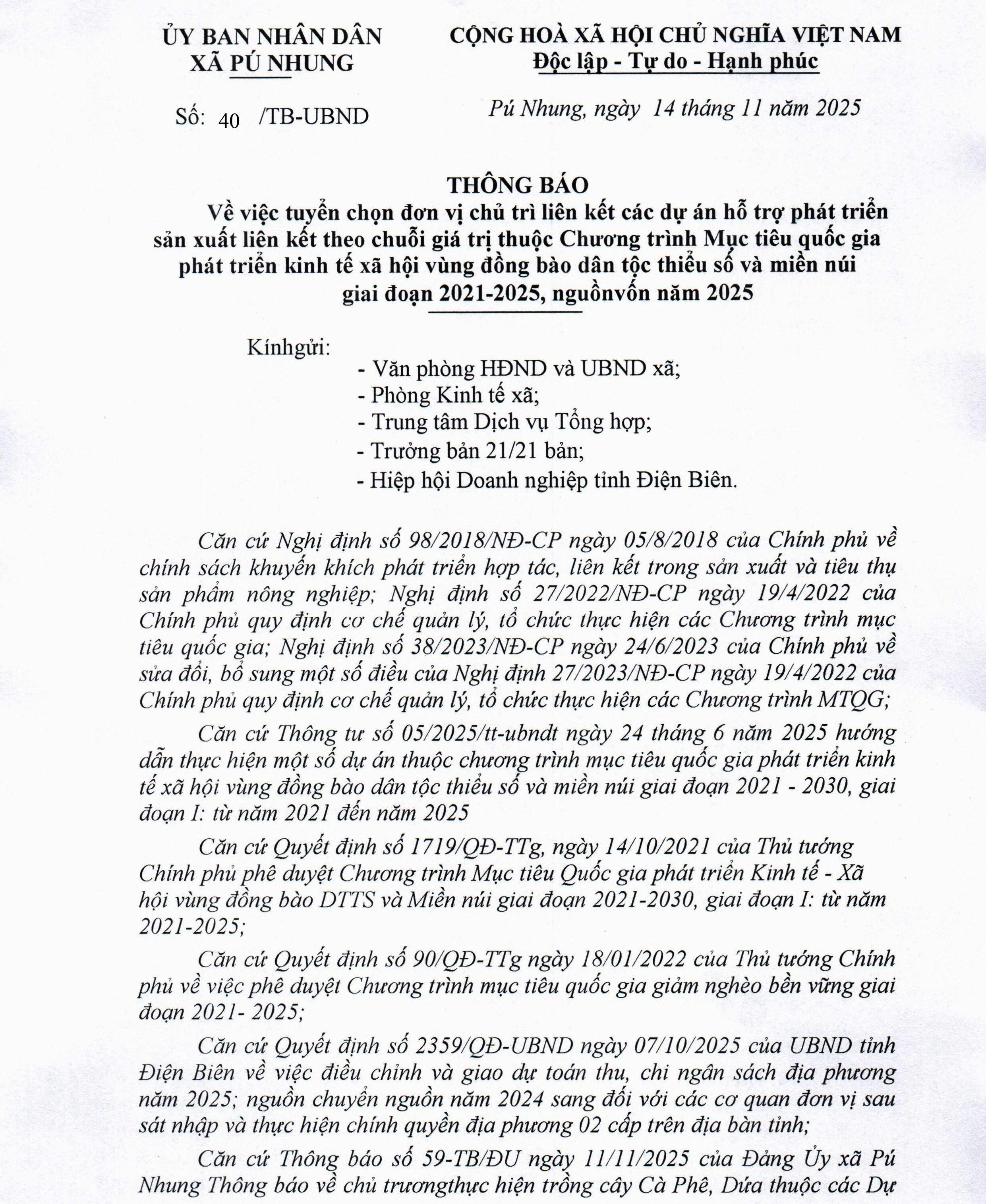 ĐBP - UBND xã Pú Nhung thông báo về việc tuyển chọn đơn vị chủ trì liên kết các dự án hỗ trợ phát triển sản xuất liên kết theo chuỗi giá trị thuộc Chương trình Mục tiêu quốc gia phát triển kinh tế xã hội vùng đồng bào dân tộc thiểu số và miền núi giai đoạn 2021-2025, nguồn vốn năm 2025.