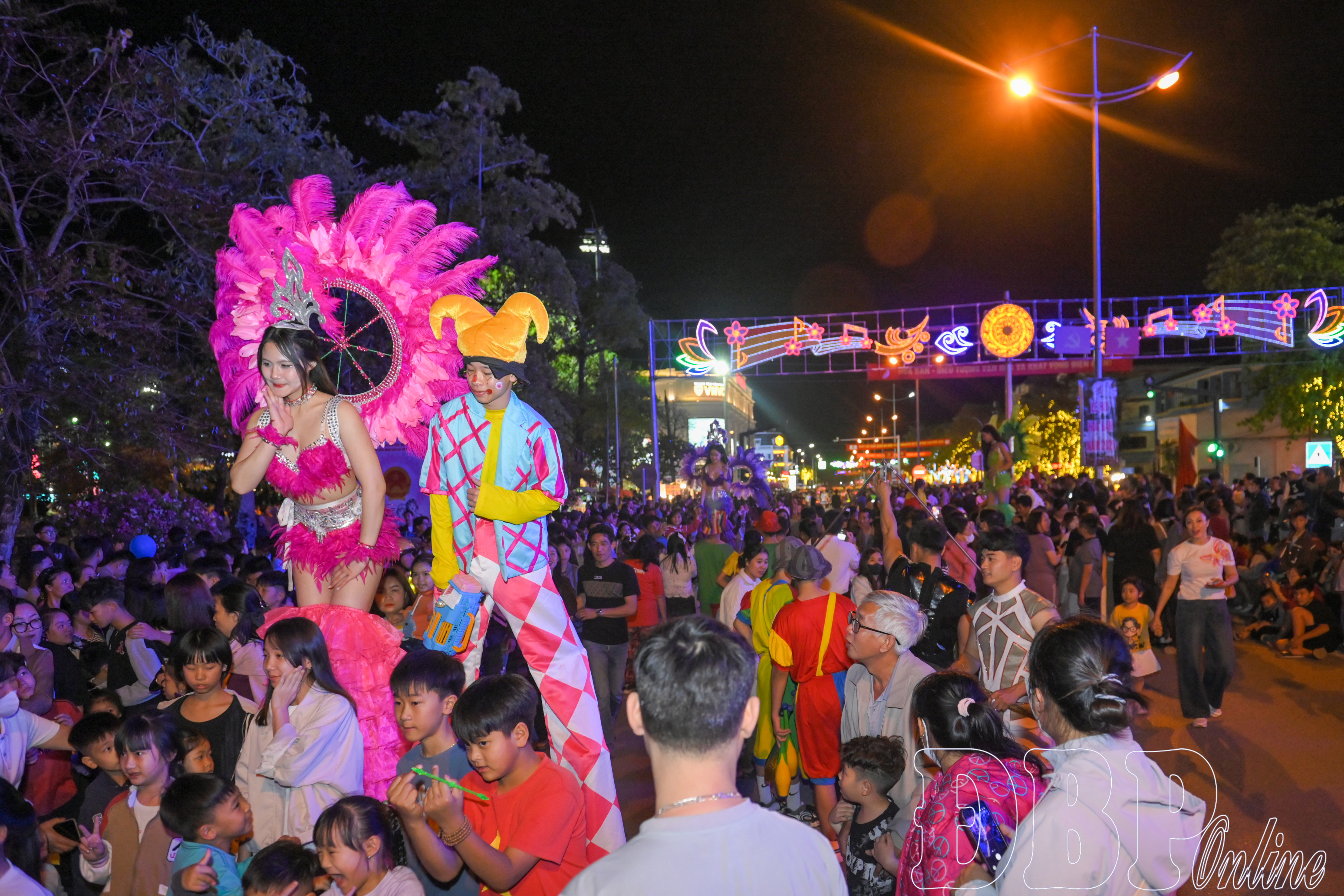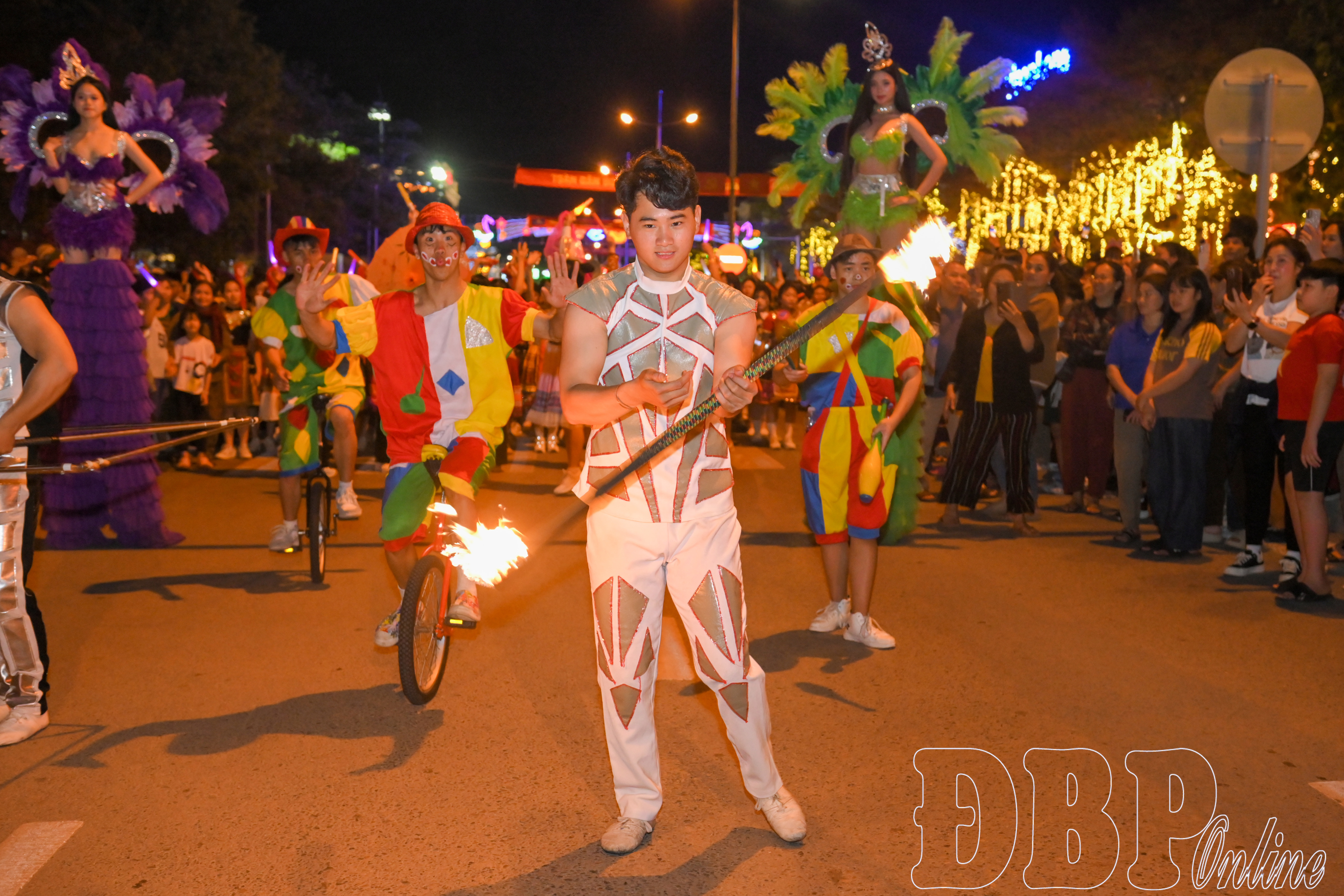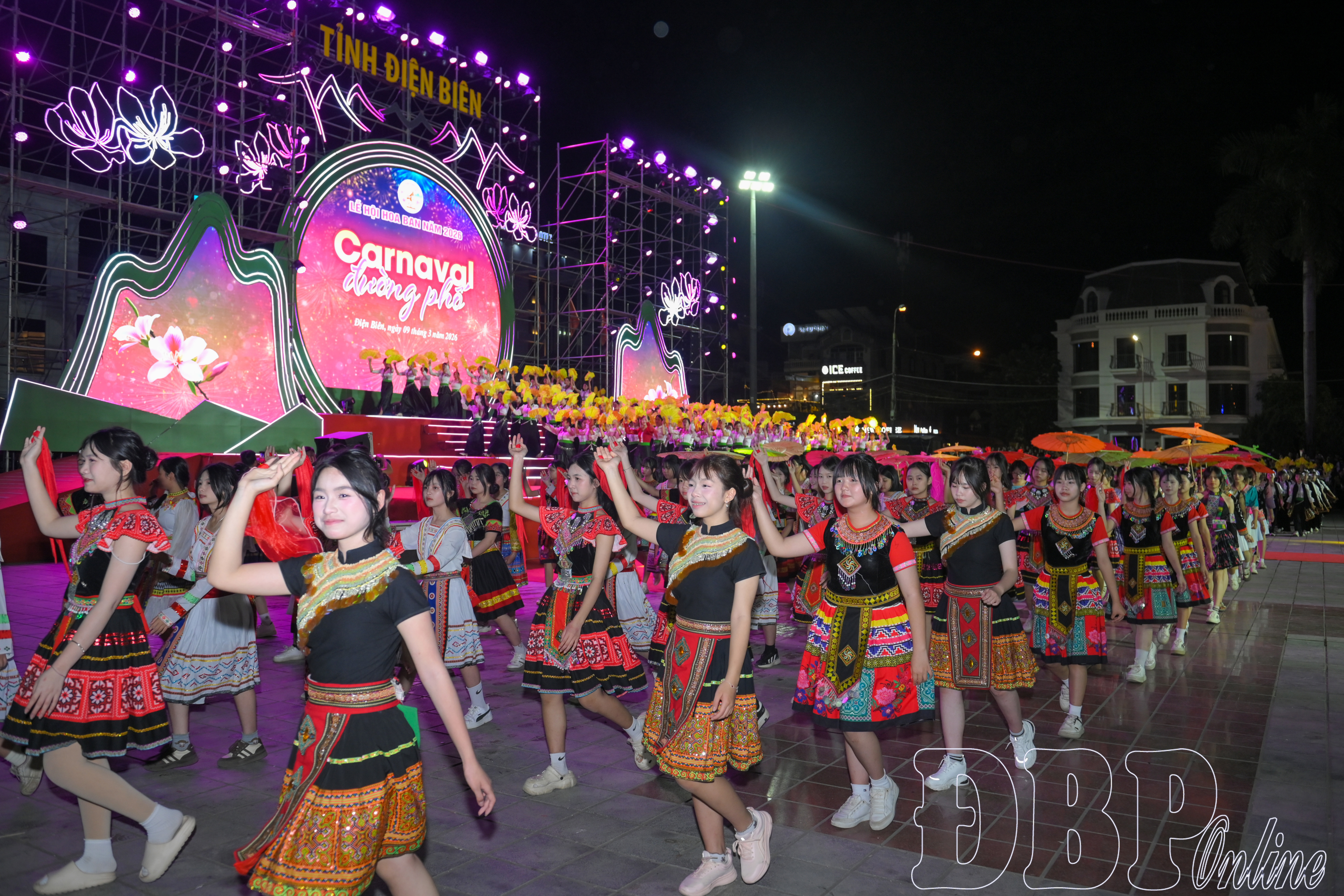 Ngay từ những phút đầu, sân khấu trung tâm tại Quảng trường 7/5 đã bừng sáng với các tiết mục ca múa tổng hợp, vũ điệu hiện đại, âm nhạc dân gian và nghệ thuật xiếc. Không gian lễ hội được mở rộng từ sân khấu ra các tuyến phố trung tâm của phường Điện Biên Phủ, nơi các đoàn diễu hành lần lượt xuất hiện với những sắc màu văn hóa đặc trưng. Các khối nghệ thuật gồm câu lạc bộ mô tô, nghệ sĩ xiếc, nhóm cosplay, đoàn nghệ thuật quốc tế, cùng các đoàn nghệ nhân và diễn viên của nhiều dân tộc trên địa bàn tỉnh đã mang đến bức tranh carnaval đa sắc, giàu tính biểu tượng.