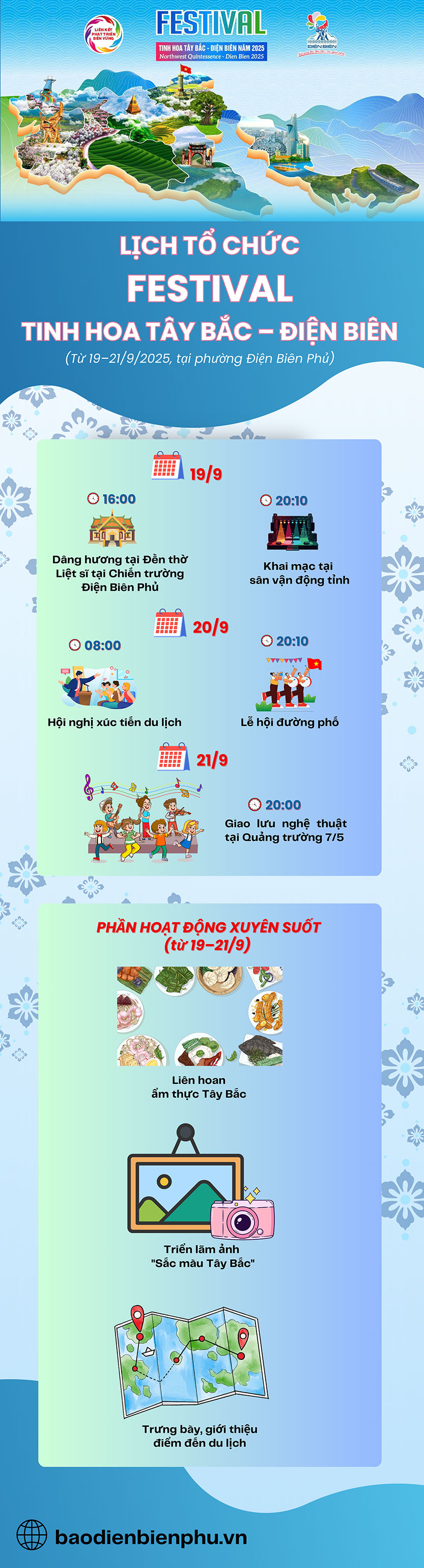 ĐBP - Festival Tinh hoa Tây Bắc - Điện Biên 2025 sẽ diễn ra từ ngày 19 - 21/9, tại phường Điện Biên Phủ, hứa hẹn mang đến chuỗi hoạt động văn hóa - du lịch hấp dẫn, đậm bản sắc vùng cao Tây Bắc. Điểm nhấn là chương trình nghệ thuật khai mạc tại Sân vận động tỉnh, lễ hội đường phố “Tinh hoa Tây Bắc”, giao lưu nghệ thuật tại Quảng trường 7/5 cùng chuỗi hoạt động xuyên suốt như liên hoan ẩm thực, triển lãm ảnh... Sự kiện là cơ hội quảng bá, kết nối, góp phần thúc đẩy phát triển du lịch Điện Biên.
