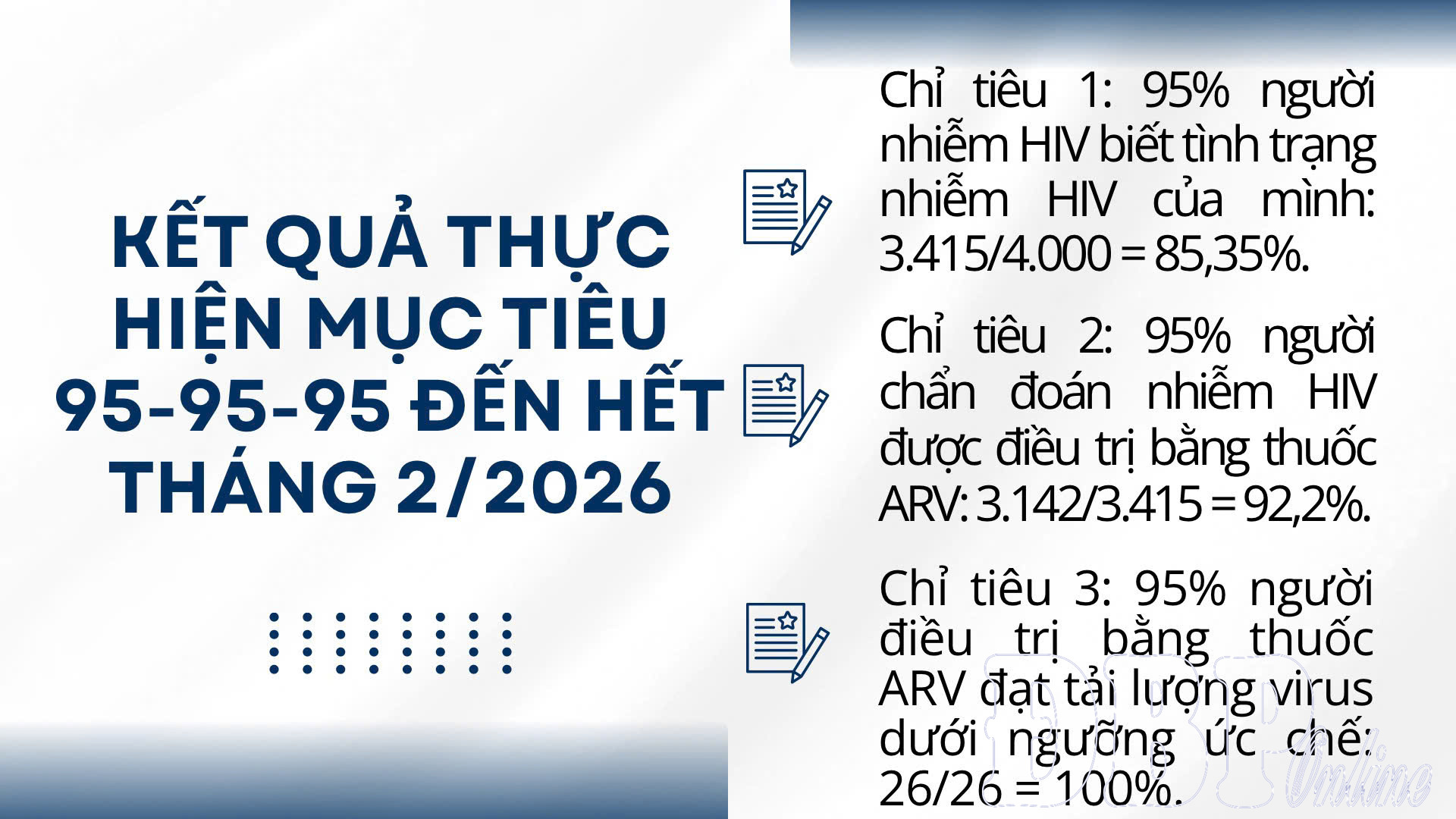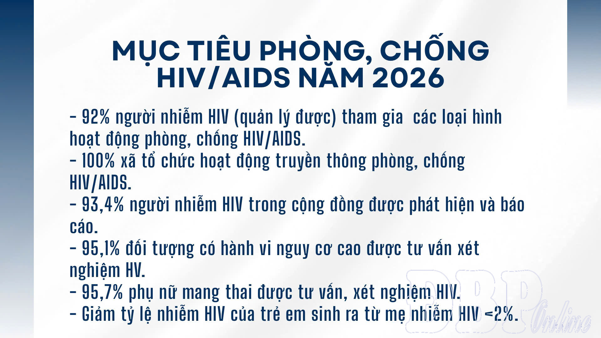 Ông Đoàn Ngọc Hùng, Giám đốc Trung tâm Kiểm soát bệnh tật tỉnh cho biết: Để đạt mục tiêu năm 2026, ngành y tế tiếp tục đẩy mạnh truyền thông, mở rộng mạng lưới cấp phát thuốc ARV, Methadone đến tuyến cơ sở. Tăng cường quản lý, chăm sóc người nhiễm HIV tại gia đình và cộng đồng, hướng tới mục tiêu kết thúc dịch AIDS vào năm 2030.