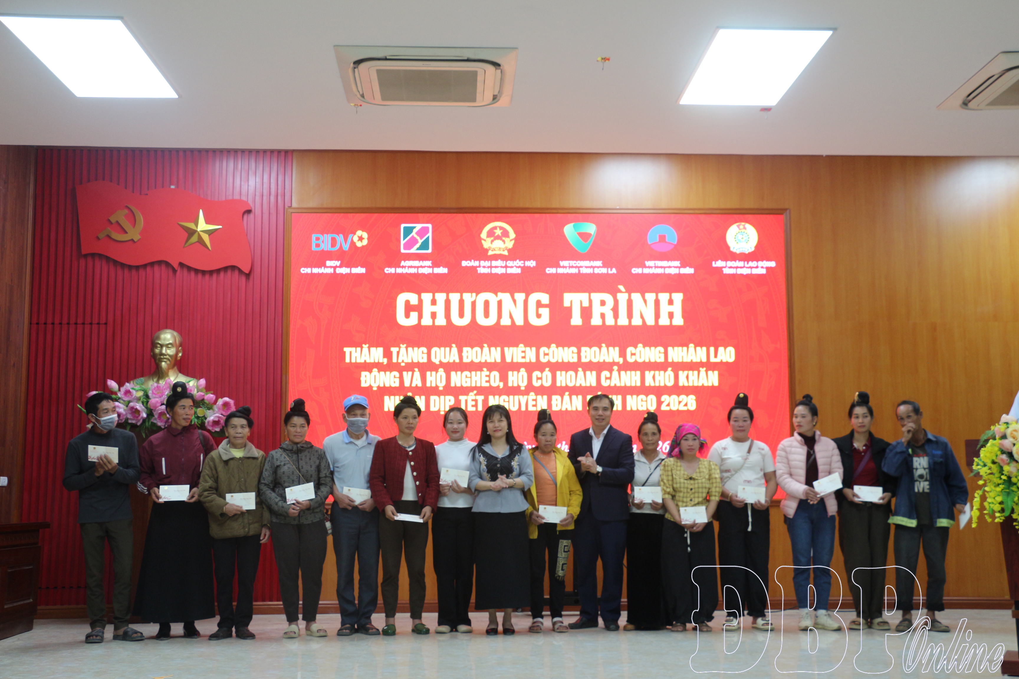 ĐBP - Nhân dịp Tết Nguyên đán Bính Ngọ 2026, chiều ngày 7/2, Đoàn đại biểu Quốc hội tỉnh Điện Biên tổ chức chương trình thăm và tặng quà cho hộ nghèo, đoàn viên công đoàn, công nhân lao động hộ có hoàn cảnh khó khăn trên địa bàn tỉnh. Chương trình có sự tham gia của đồng chí Tạ Thị Yên, Phó Chủ nhiệm Ủy ban Công tác đại biểu của Quốc hội, Đại biểu Quốc hội tỉnh; Lò Thị Luyến, Phó Trưởng Đoàn chuyên trách phụ trách Đoàn ĐBQH tỉnh cùng đại diện các đơn vị tài trợ.