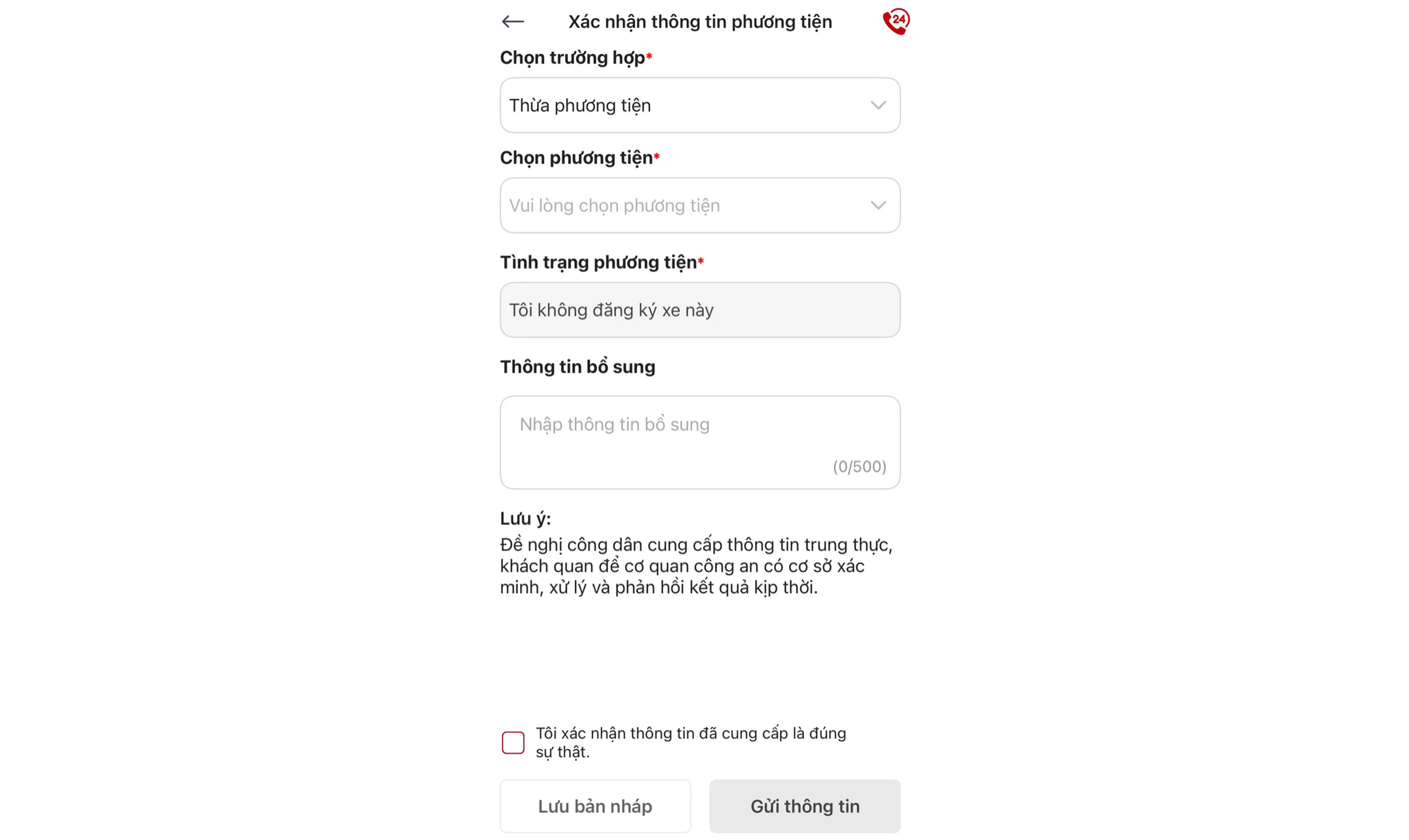Để xoá xe đã bán trên ứng dụng, người dân có thể thực hiện các bước khai báo tình trạng phương tiện như sau: