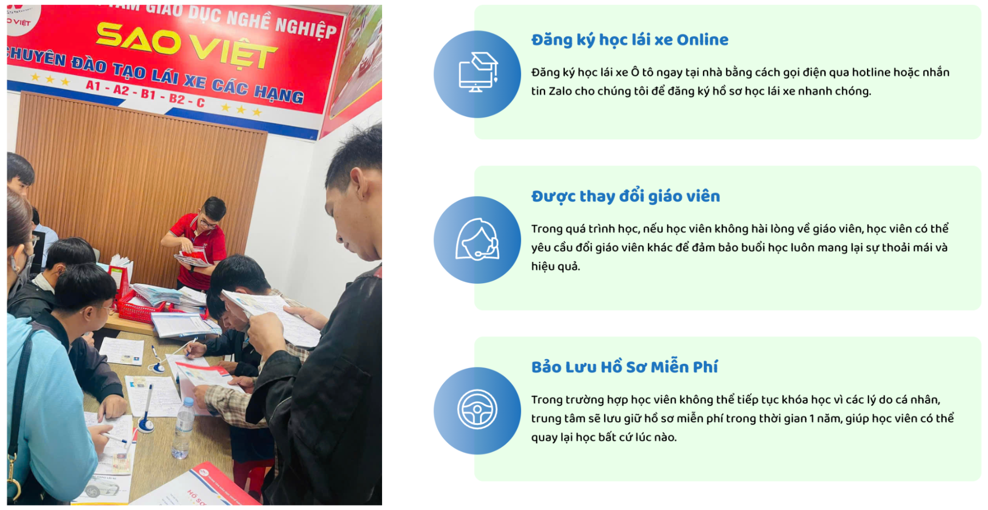 Những khóa học này được thiết kế bài bản, với lộ trình rõ ràng từ lý thuyết đến thực hành, giúp học viên tự tin bước vào kỳ thi sát hạch. Đặc biệt, Sao Việt cam kết đồng hành cùng học viên từ lúc đăng ký đến khi hoàn thành kỳ thi, tạo điều kiện thuận lợi cho người học.