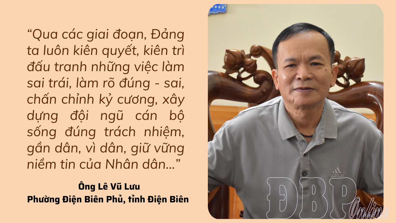 Ông Lê Vũ Lưu, phường Điện Biên Phủ chia sẻ: Chúng tôi rất mừng khi Đảng kiên quyết xử lý những cán bộ sai phạm. Nhưng nói thật, cũng thấy buồn vì mấy năm gần đây có nhiều cán bộ giữ chức vụ bị bắt, bị xử lý. Điều đó cho thấy một bộ phận cán bộ đã sa sút về đạo đức, lối sống. Dù vậy, bà con vẫn tin rằng việc làm quyết liệt như vậy là đúng, thể hiện quyết tâm của Đảng giữ bộ máy ngày càng trong sạch, vững mạnh.
