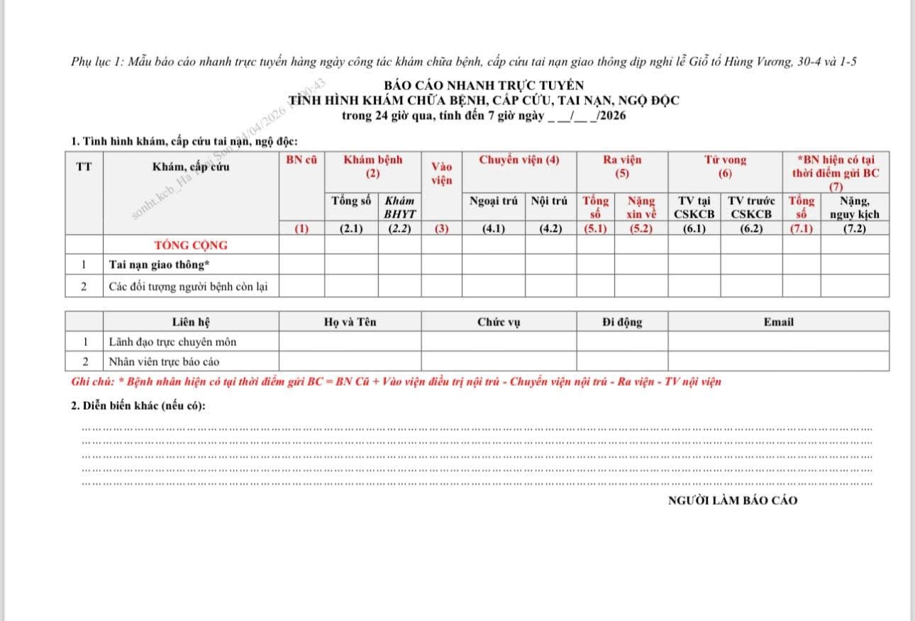 Ngày 24/4/2026, Thứ trưởng Bộ Y tế Trần Văn Thuấn đã ký ban hành Công văn số 2989/BYT-KCB gửi các bệnh viện trực thuộc Bộ, Sở Y tế các tỉnh, thành phố và y tế các bộ, ngành về việc bảo đảm công tác y tế trong dịp nghỉ lễ Giỗ Tổ Hùng Vương và ngày Chiến thắng 30/4 - Quốc tế lao động 1/5.